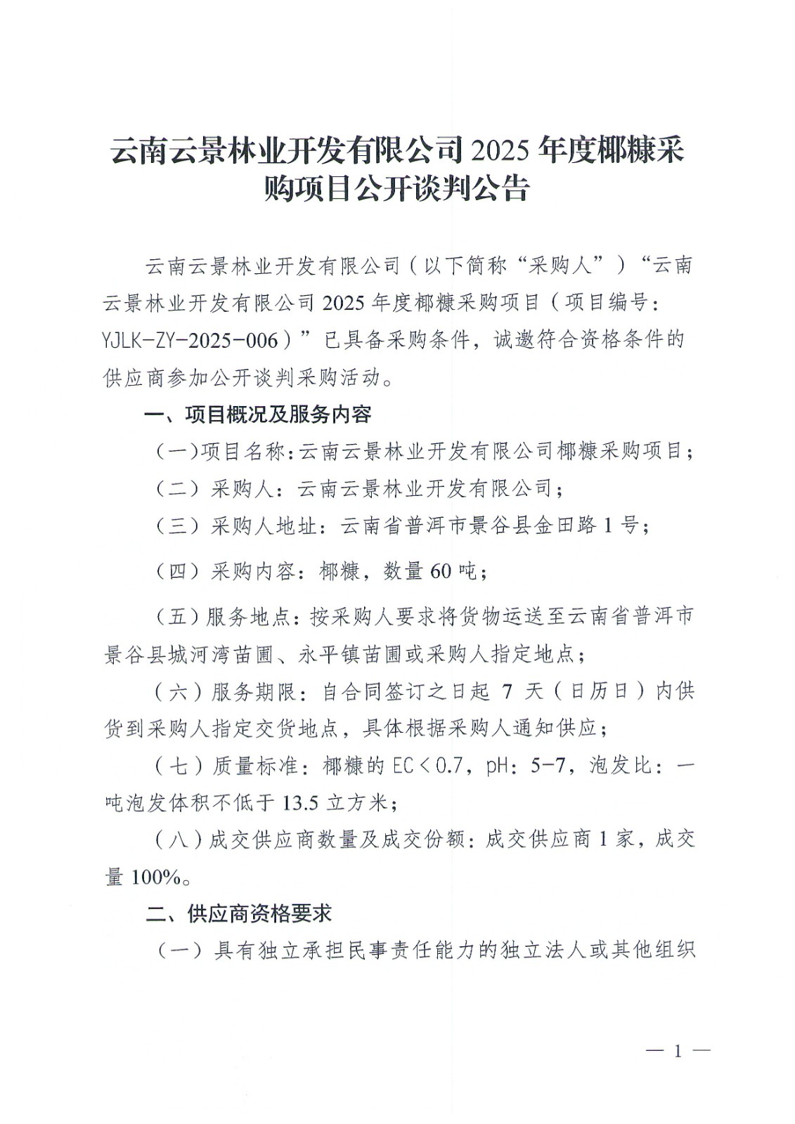 云南云景林業(yè)開發(fā)有限公司2025年度糠采購(gòu)項(xiàng)目公開談判公告