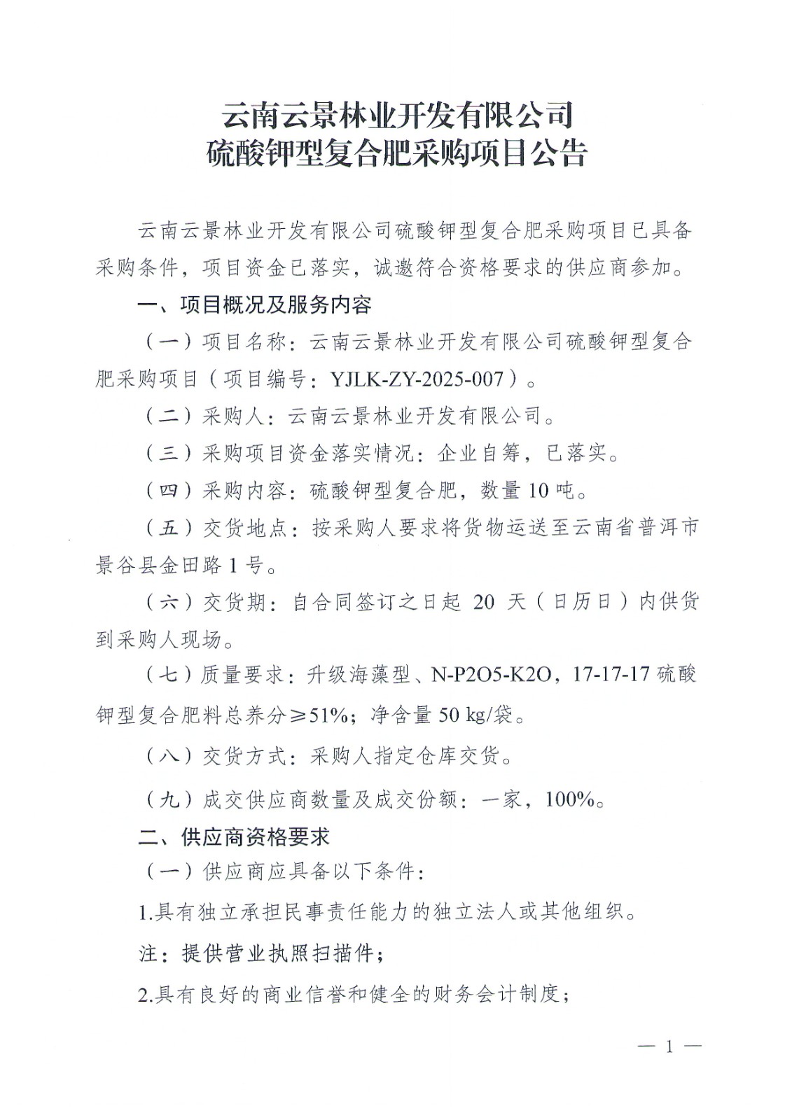 云南云景林業(yè)開發(fā)有限公司硫酸鉀型復(fù)合肥采購項(xiàng)目公告