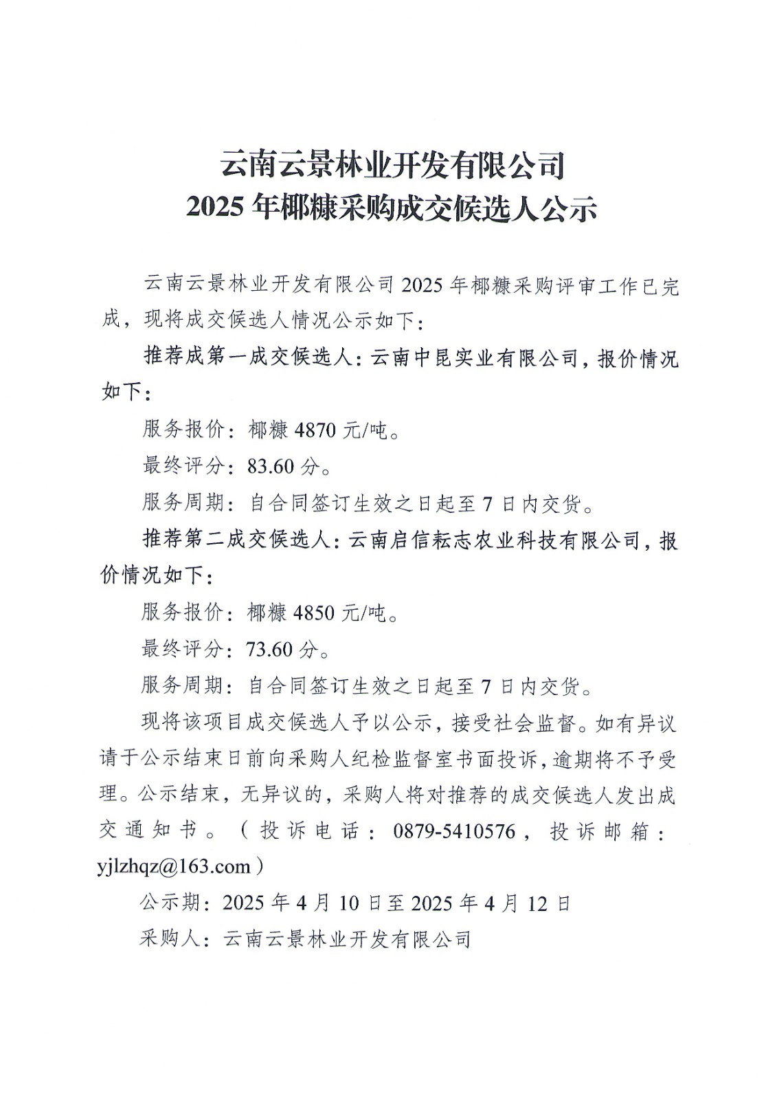云南云景林業(yè)開發(fā)有限公司2025年椰糠采購成交候選人公示