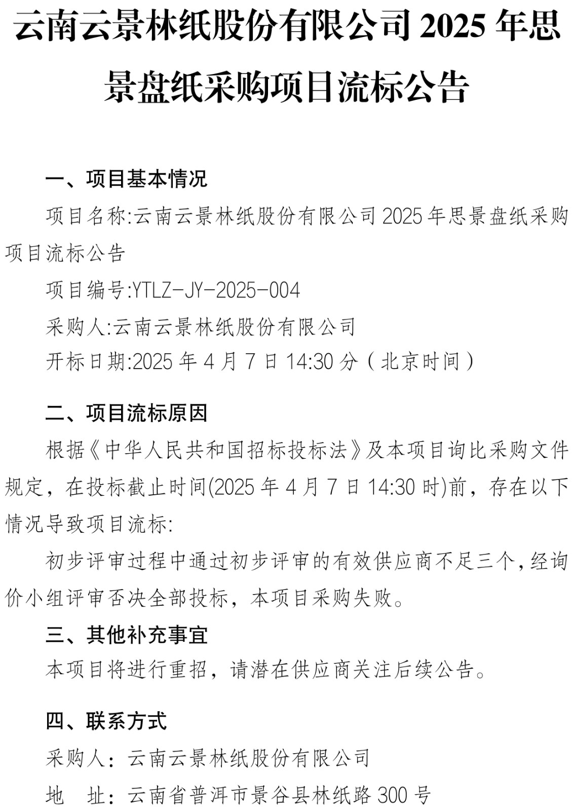 云南云景林紙股份有限公司2025年思景柔巾采購(gòu)項(xiàng)目流標(biāo)公告