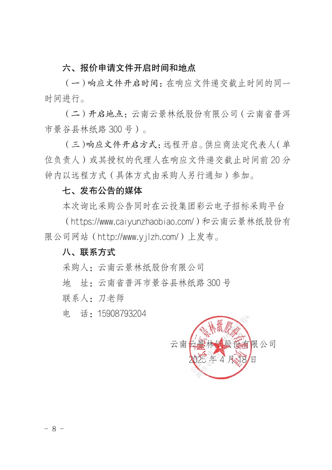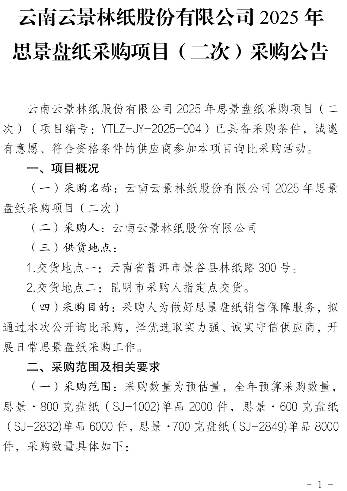 云南云景林紙股份有限公司2025年思景盤紙采購項(xiàng)目(二次)采購公告