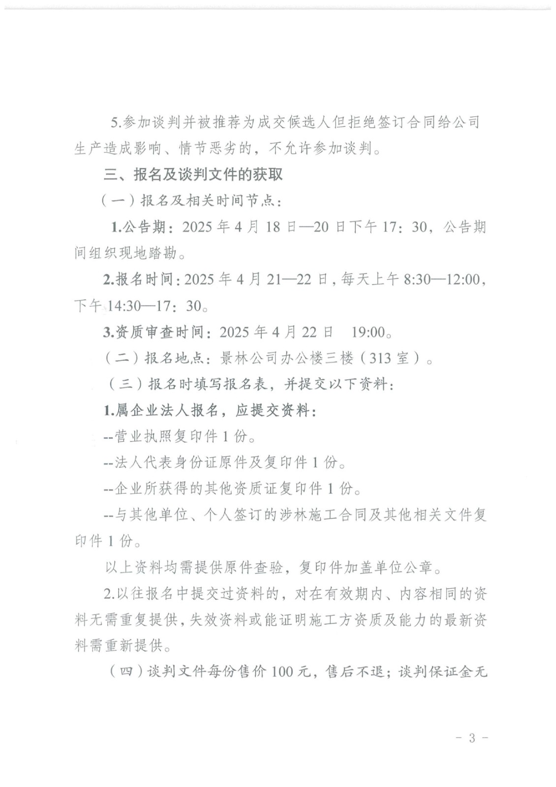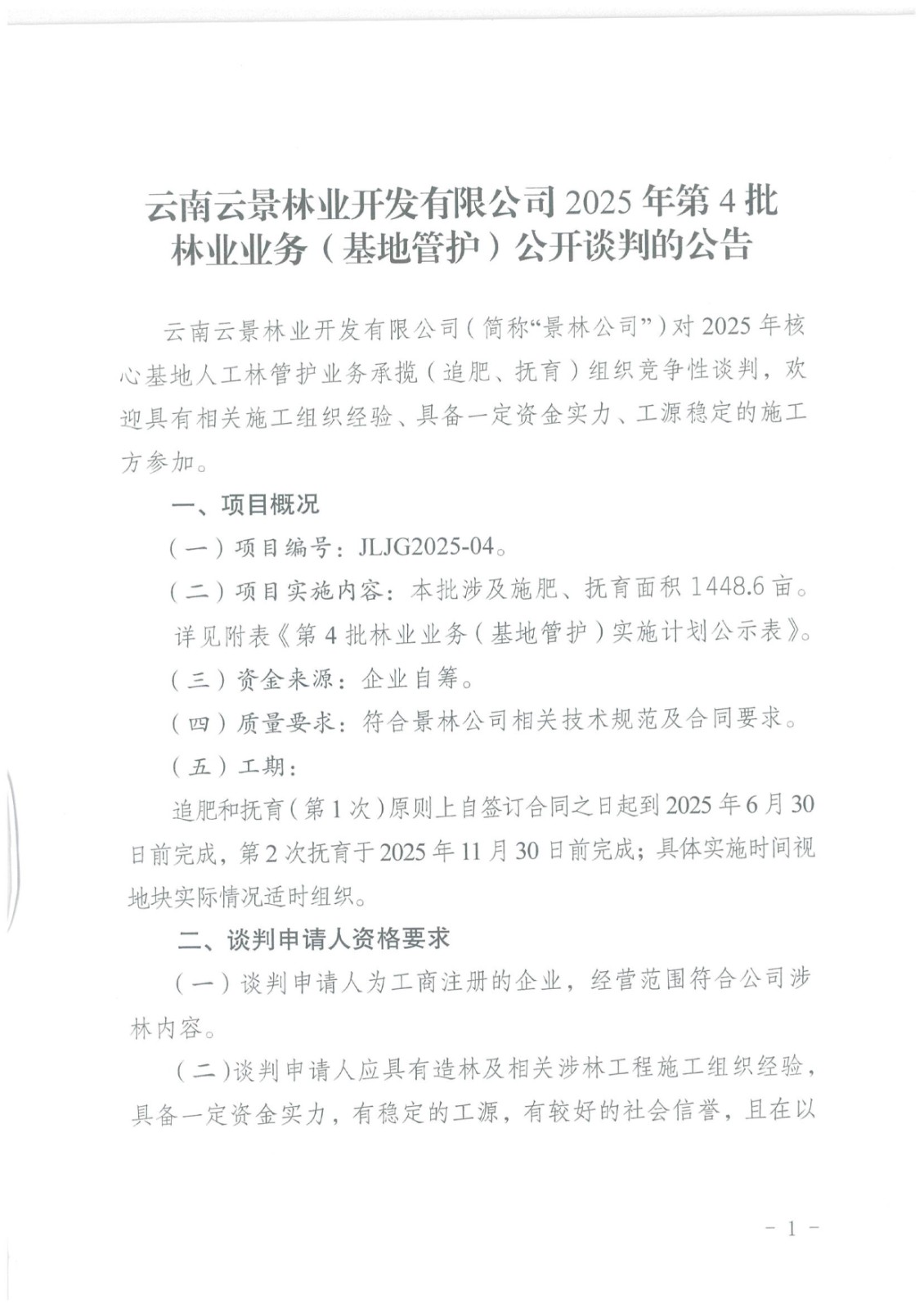 云南云景林業(yè)開發(fā)有限公司2025年第4批林業(yè)業(yè)務(wù)(基地管護(hù))公開談判的公告