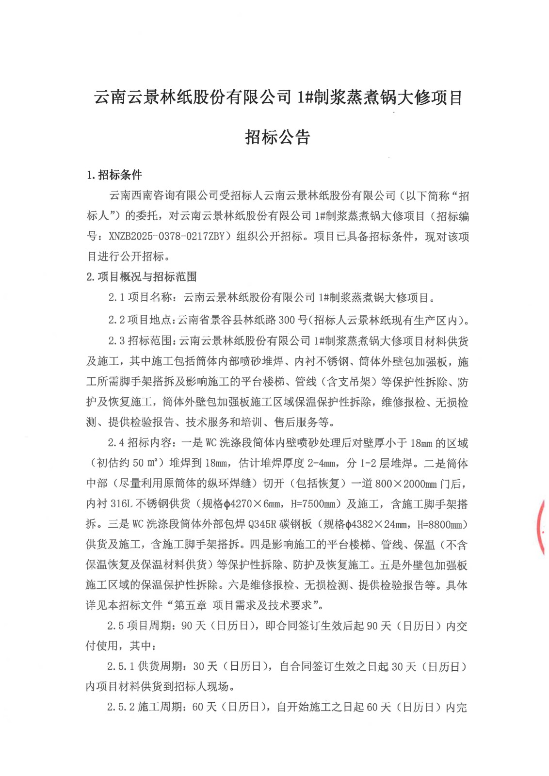 云南云景林紙股份有限公司1#制漿蒸煮鍋大修項目招標公告