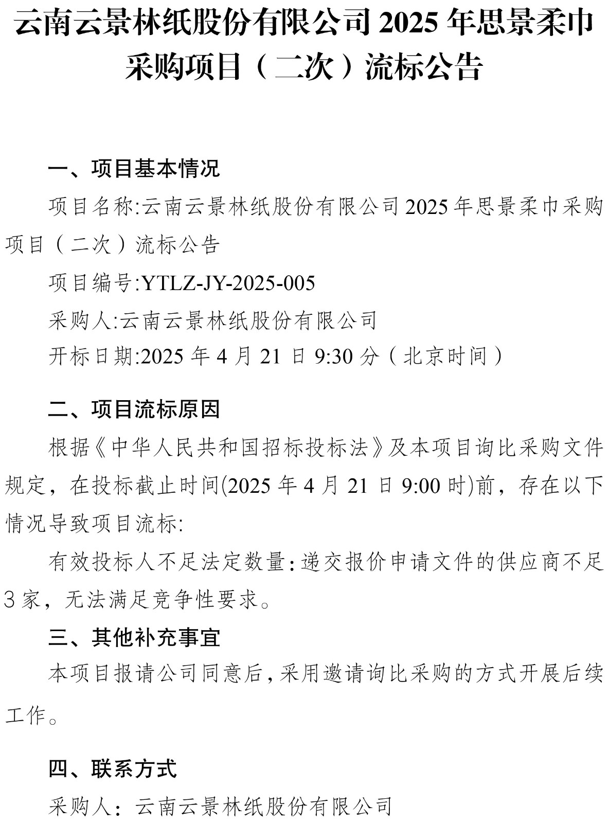 云南云景林紙股份有限公司2025年思景柔巾采購項(xiàng)目(二次)流標(biāo)公告