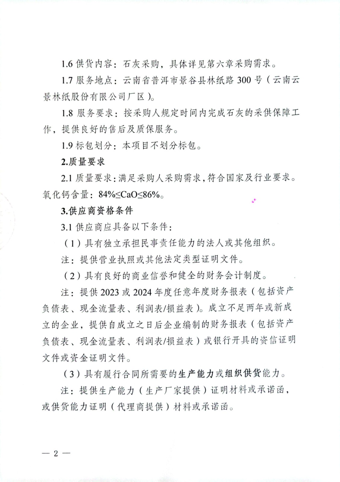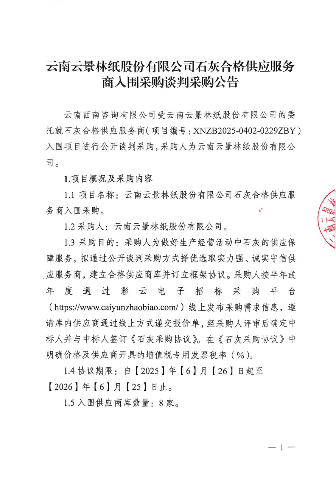 云南云景林紙股份有限公司石灰合格供應服務商入圍采購談判采購公告