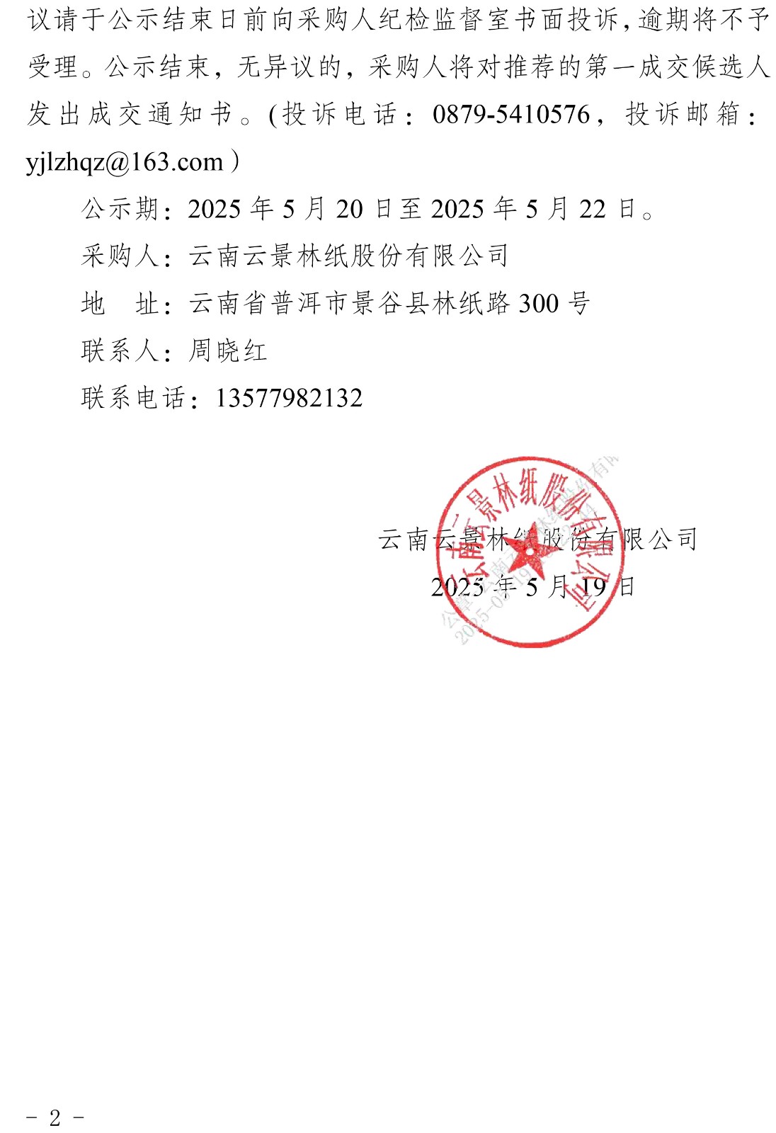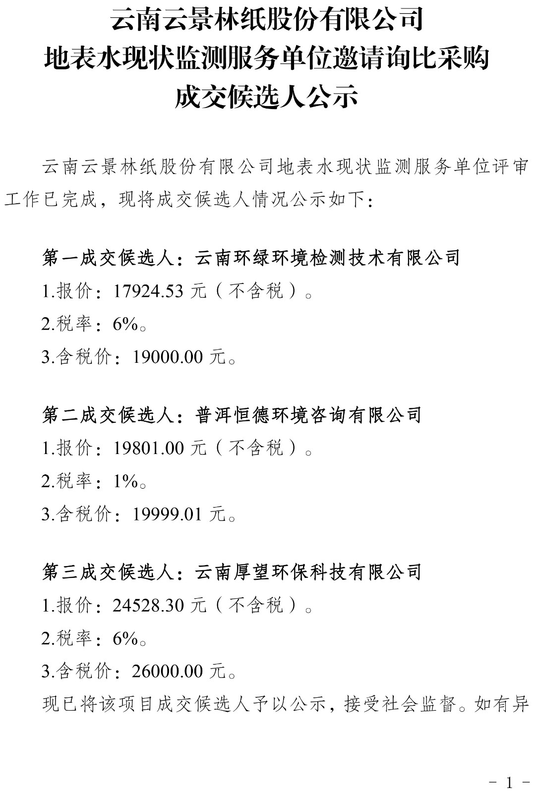 云南云景林紙股份有限公司地表水現(xiàn)狀監(jiān)測(cè)服務(wù)單位邀請(qǐng)?jiān)儽炔少?gòu)成交候選人公示