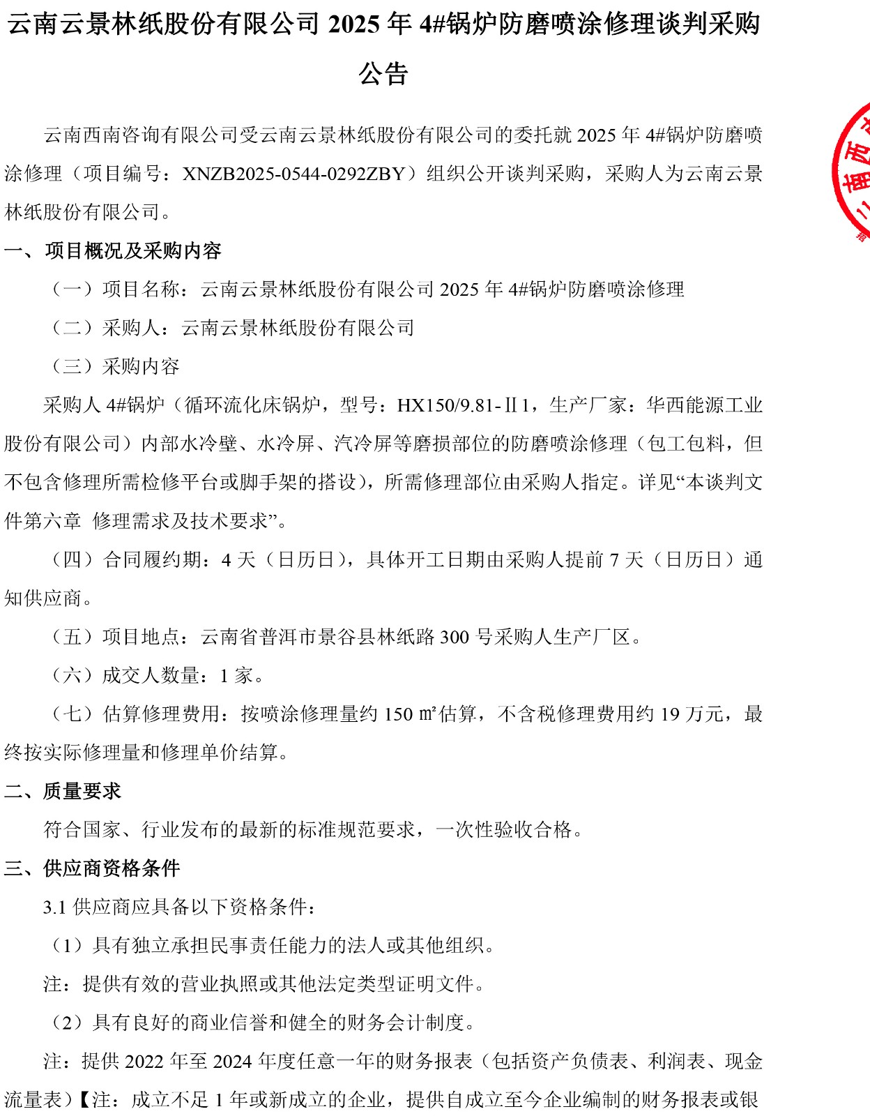 云南云景林紙股份有限公司2025年4#鍋爐防磨噴涂修理談判采購公告