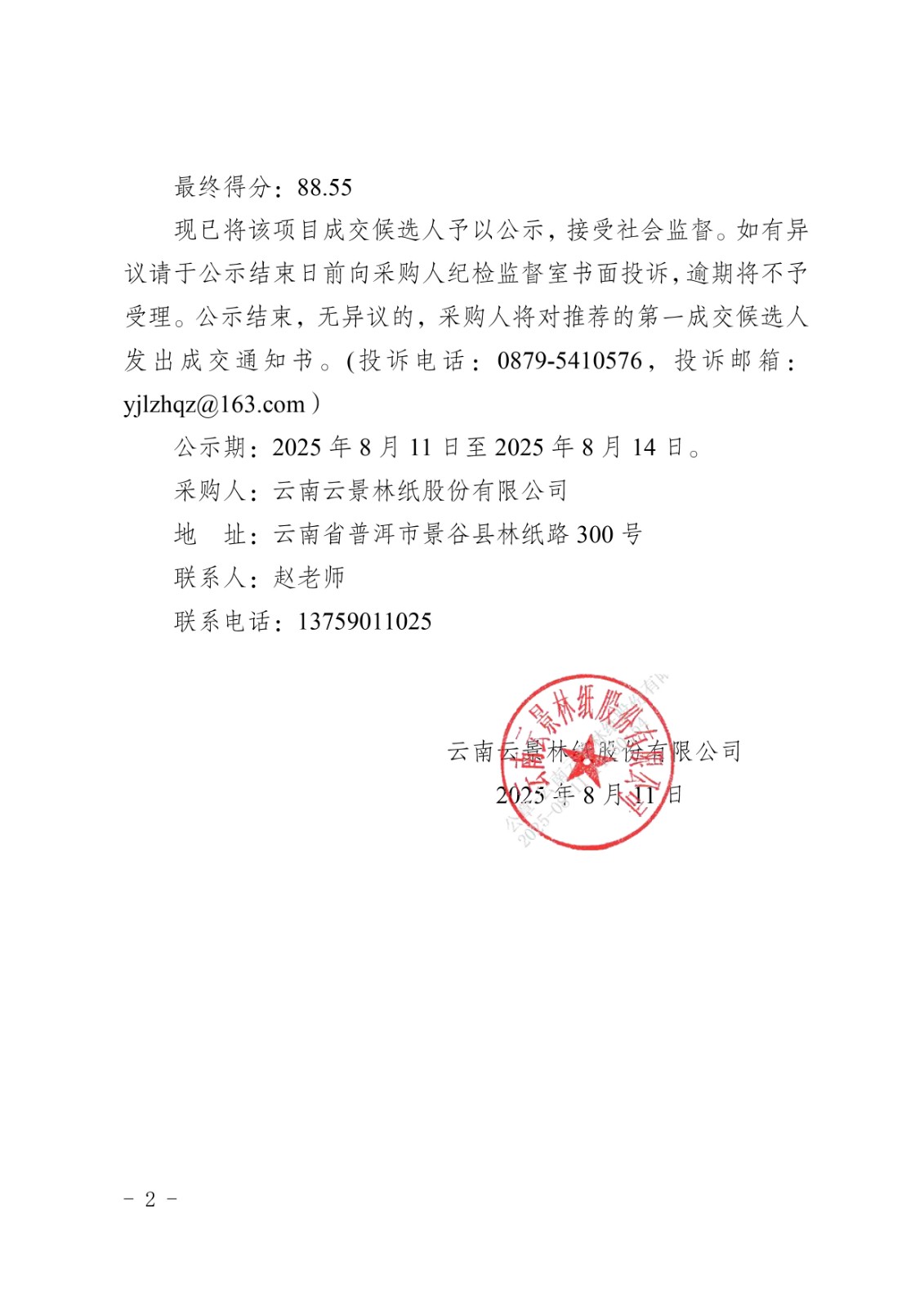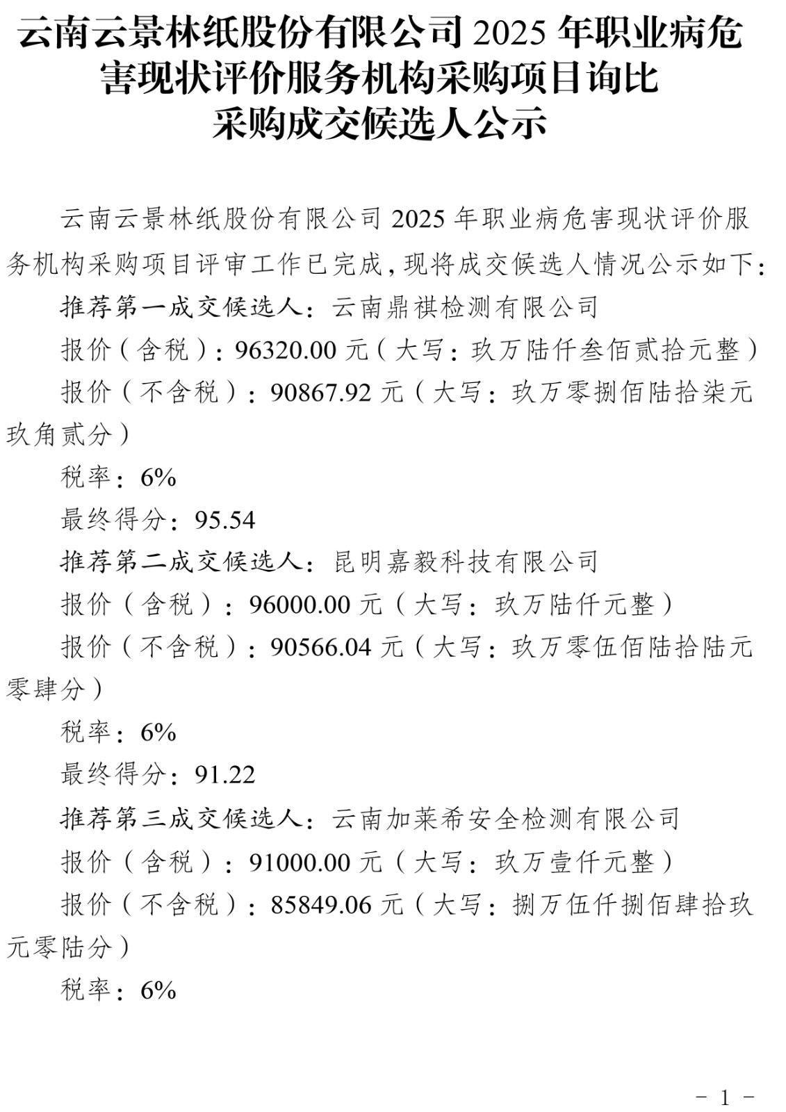 云南云景林紙股份有限公司2025年職業(yè)病危害現(xiàn)狀評(píng)價(jià)服務(wù)機(jī)構(gòu)采購(gòu)項(xiàng)目詢比采購(gòu)成交候選人公示