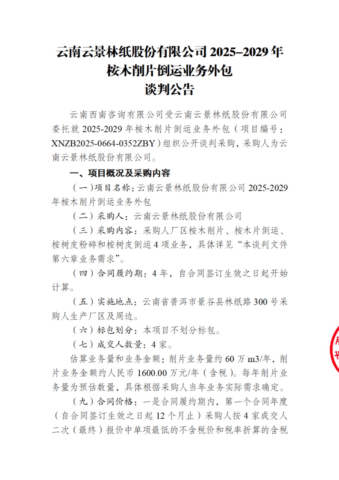云南云景林紙股份有限公司2025-2029年松木削片倒運(yùn)業(yè)務(wù)外包談判公告