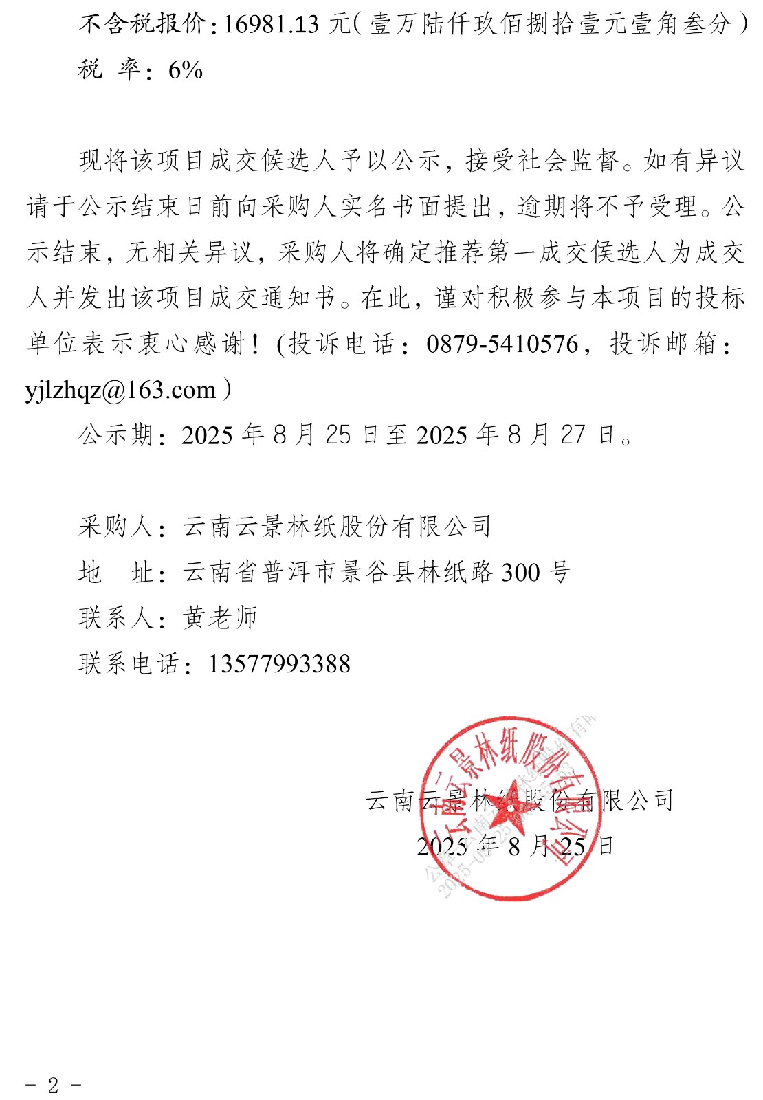 云南云景林紙股份有限公司生產安全事故應急預案評審服務機構詢比采購成交候選人公示