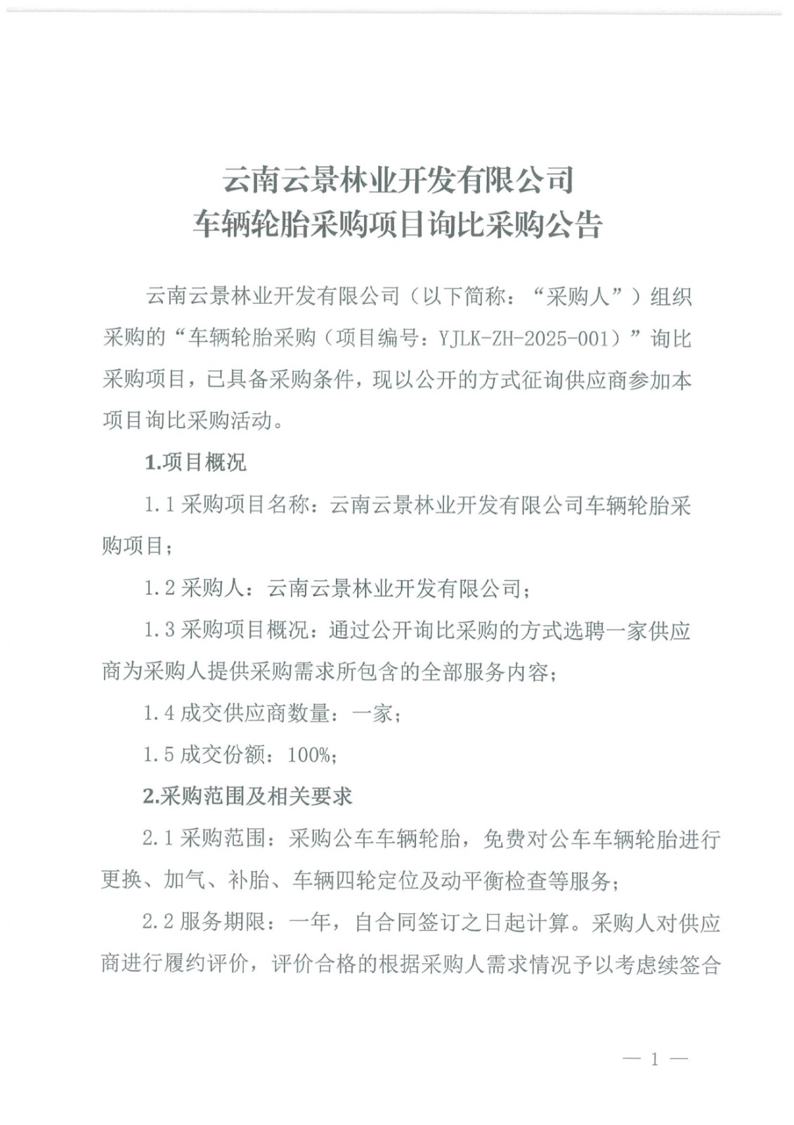 云南云景林業(yè)開發(fā)有限公司車輛輪胎采購(gòu)項(xiàng)目詢比采購(gòu)公告