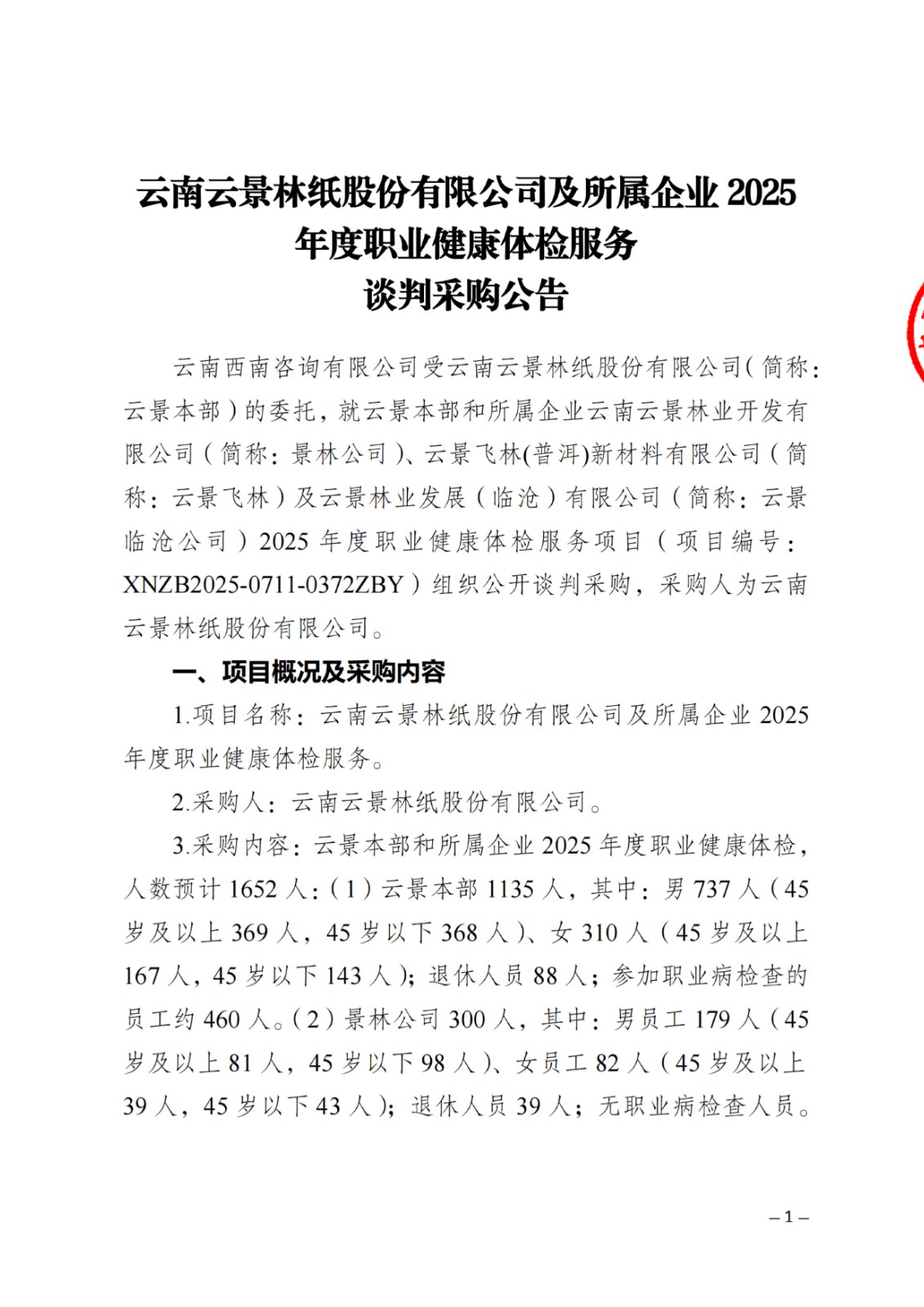 云南云景林紙股份有限公司及所屬企業(yè)2025年度職業(yè)健康體檢服務(wù)談判采購(gòu)公告