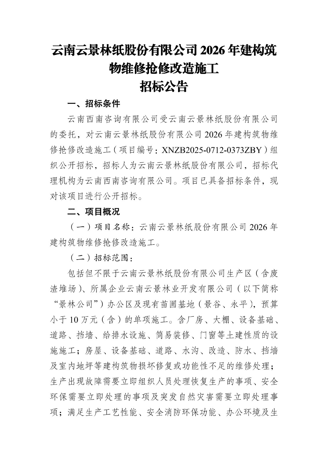 云南云景林紙股份有限公司2026年建構(gòu)筑物維修搶修改造施工招標(biāo)公告