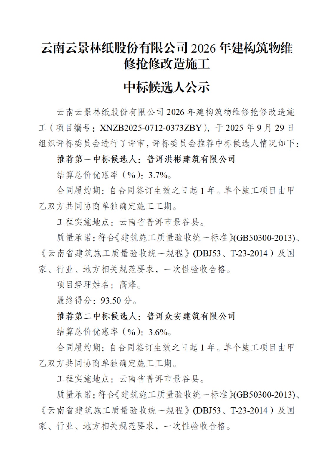 云南云景林紙股份有限公司2026年建構筑物維修搶修改造施工中標候選人公示