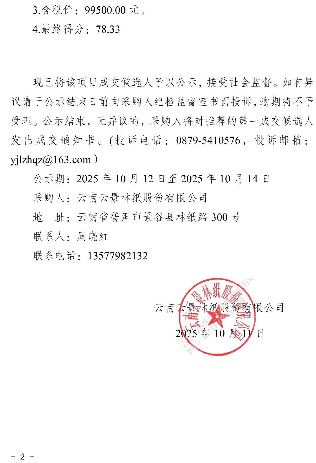 云南云景林紙股份有限公司2026年建構筑物維修搶修改造施工中標候選人公示