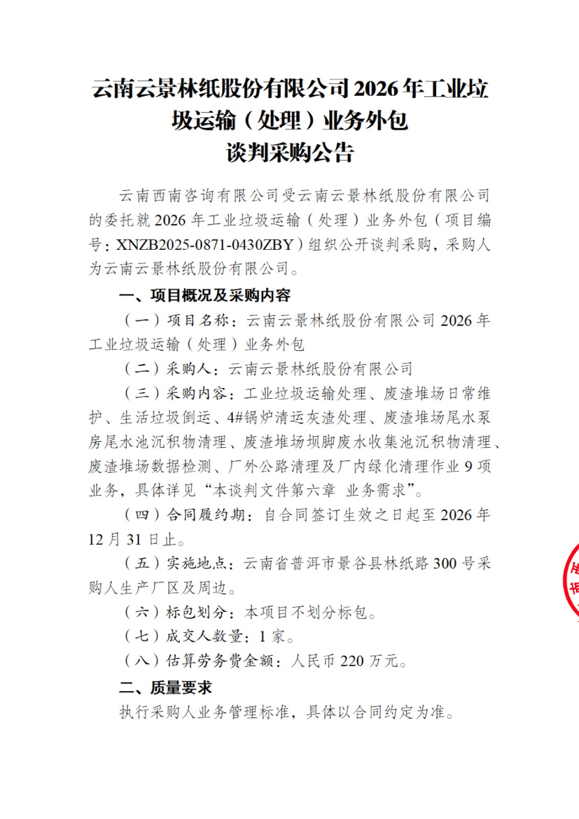 云南云景林紙股份有限公司2026年工業(yè)垃圾運(yùn)輸(處理)業(yè)務(wù)外包談判采購公告