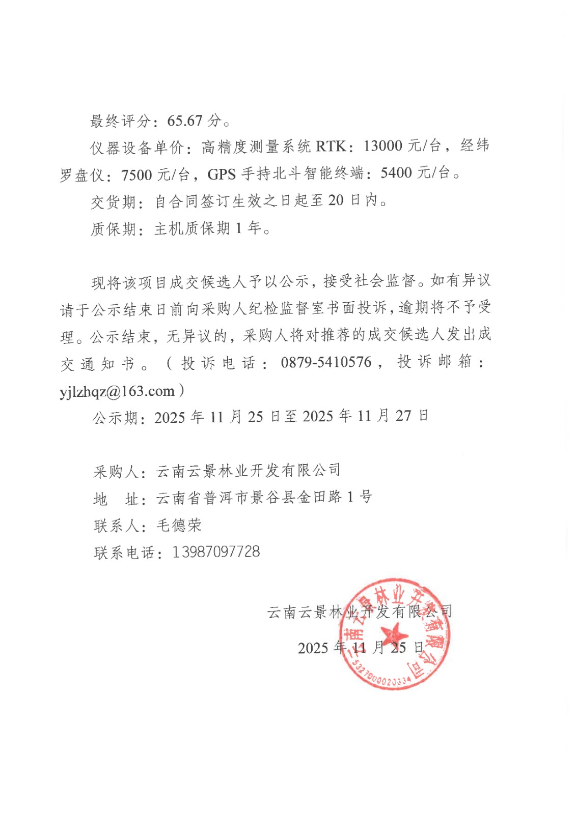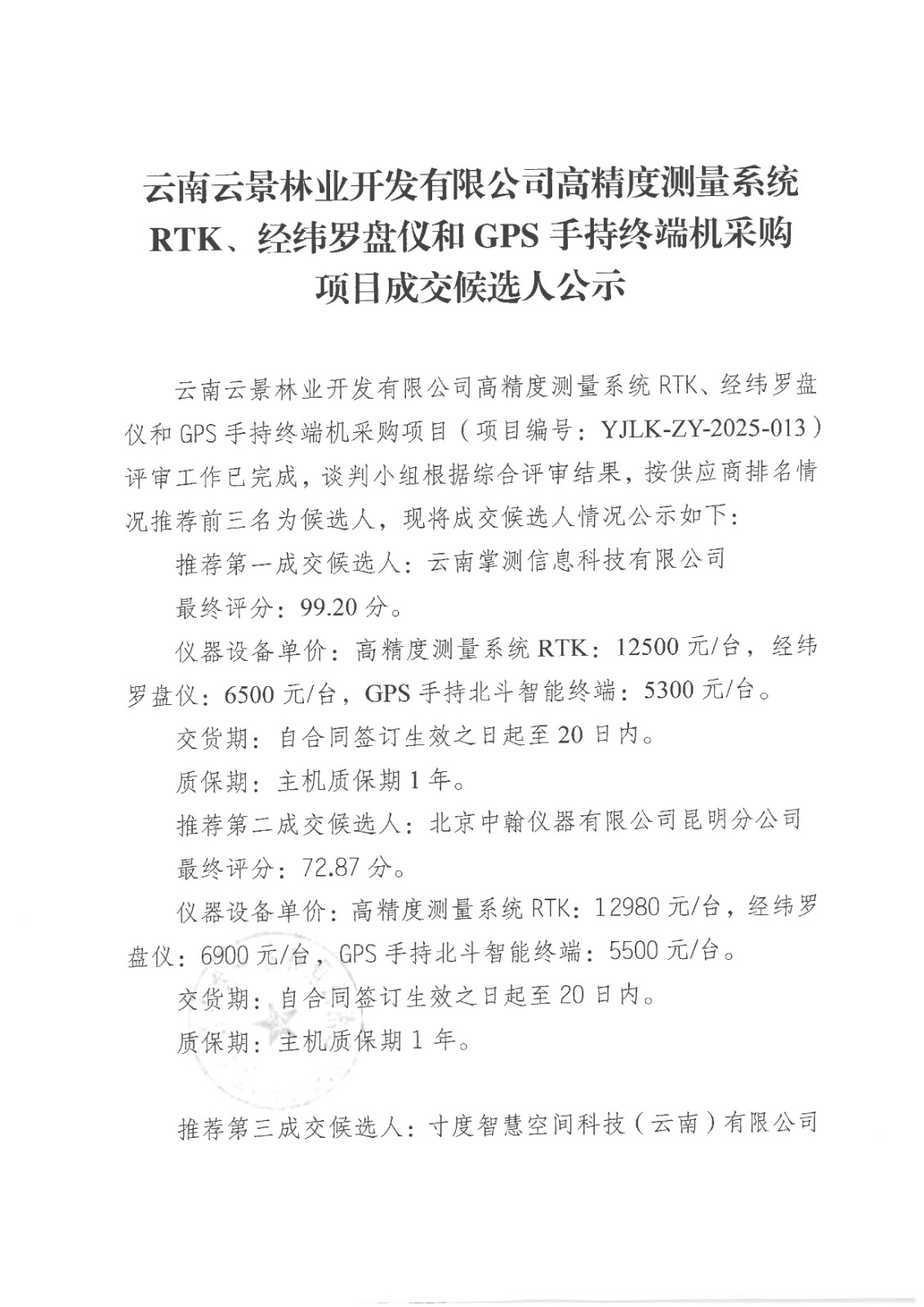 云南云景林業(yè)開發(fā)有限公司高精度測量系統(tǒng)RTK、經(jīng)緯羅盤儀和GPS手持終端機采購項目成交候選人公示