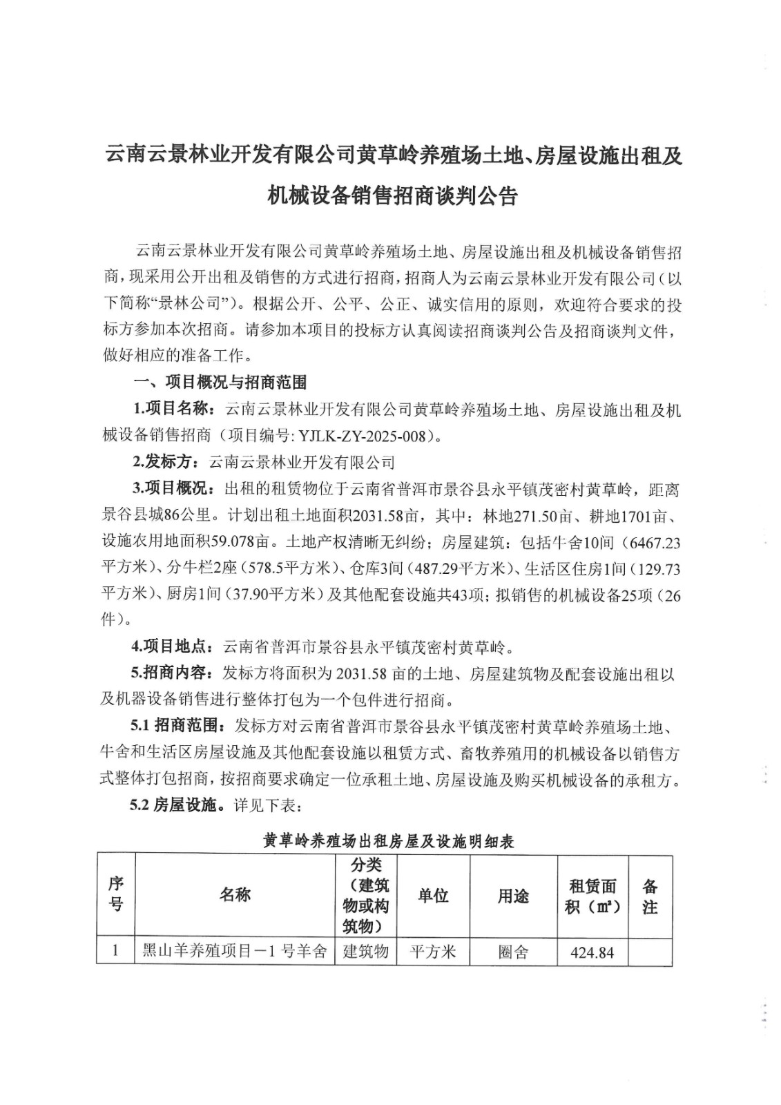 云南云景林業(yè)開發(fā)有限公司黃草嶺養(yǎng)殖場土地、房屋設(shè)施出租及機械設(shè)備銷售招商談判公告