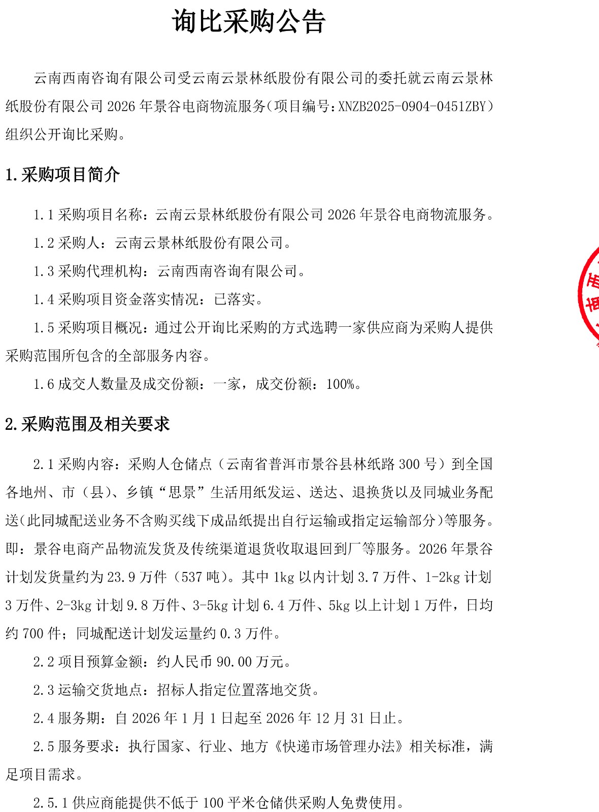 云南云景林紙股份有限公司2026年零星設(shè)備檢修安裝工程項(xiàng)目談判公告