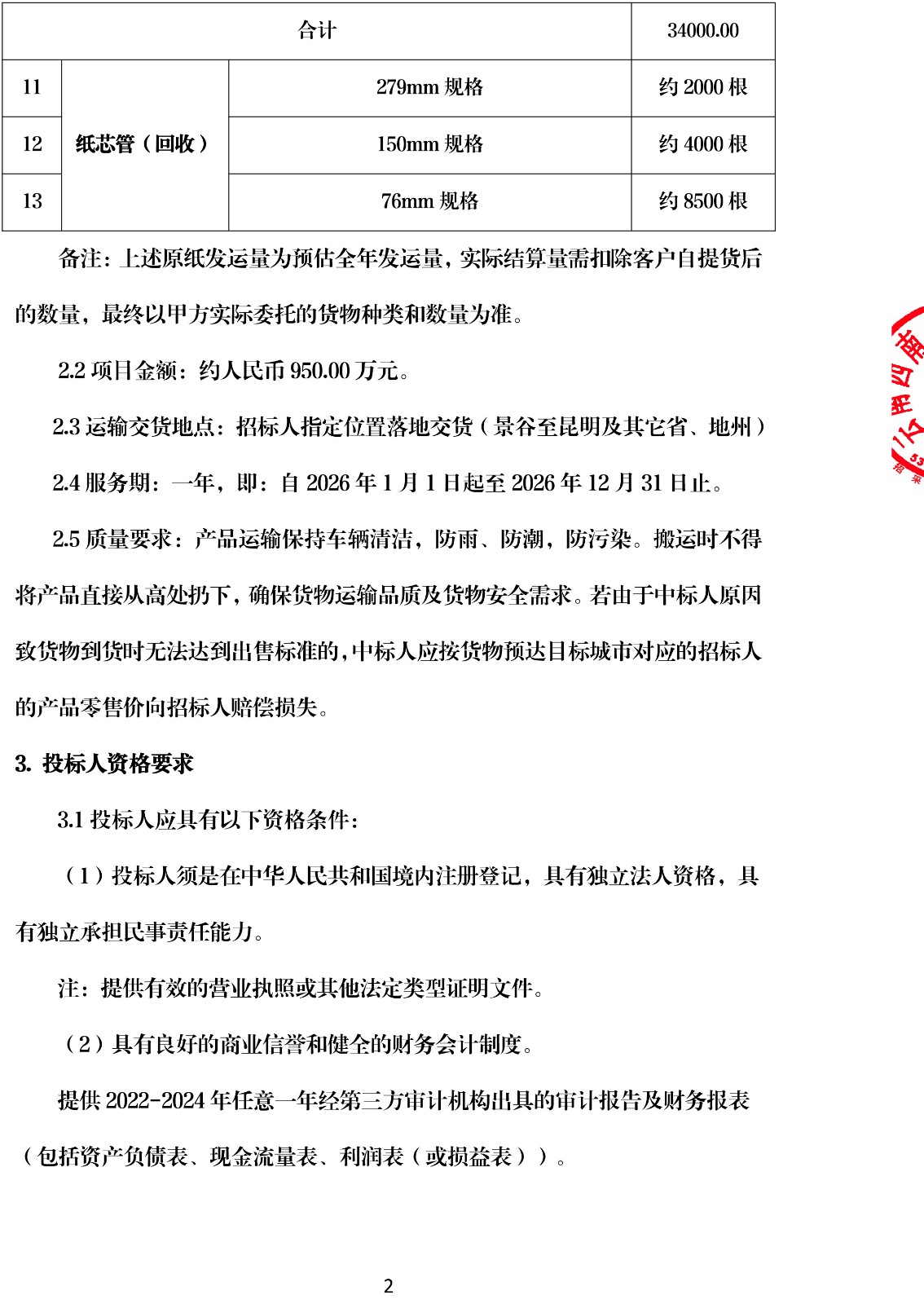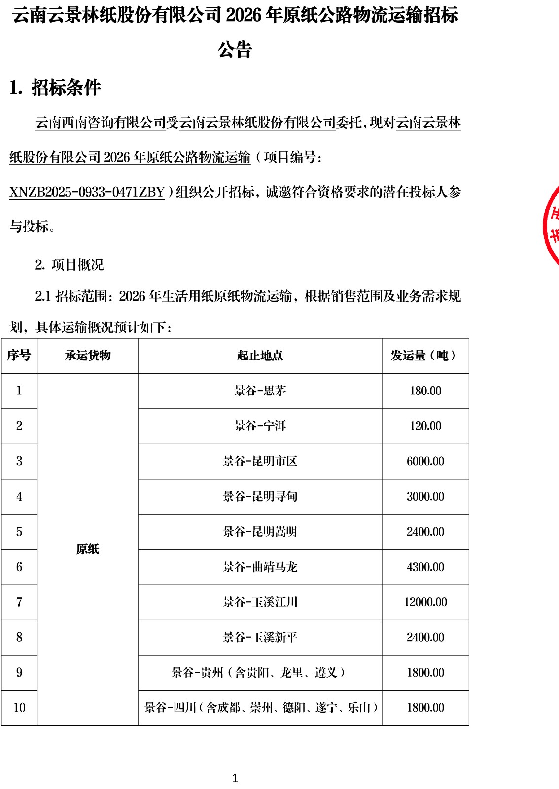 云南云景林紙股份有限公司2026年原紙公路物流運輸招標公告