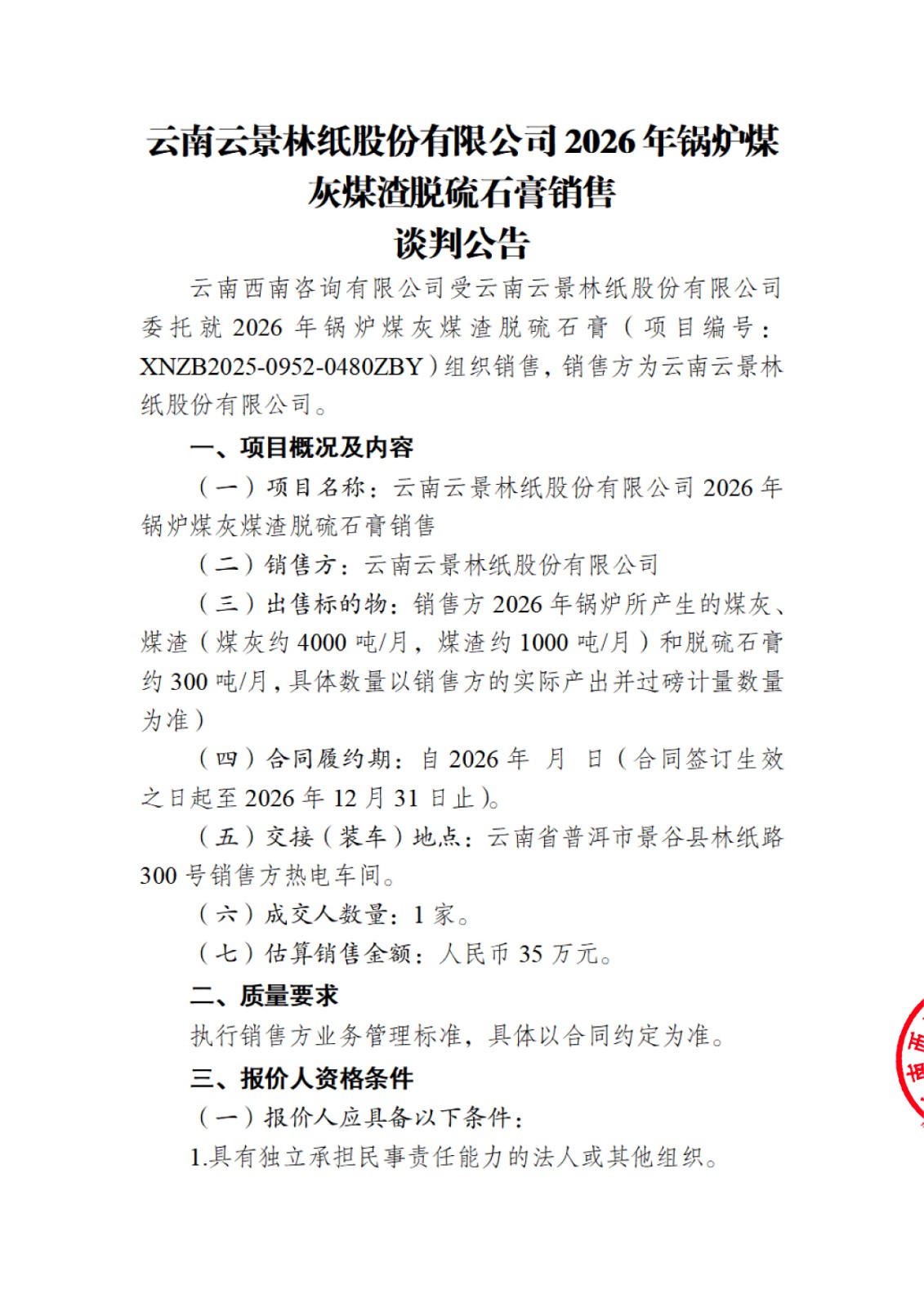 云南云景林紙股份有限公司2026年鍋爐煤灰煤渣脫硫石膏銷(xiāo)售談判公告