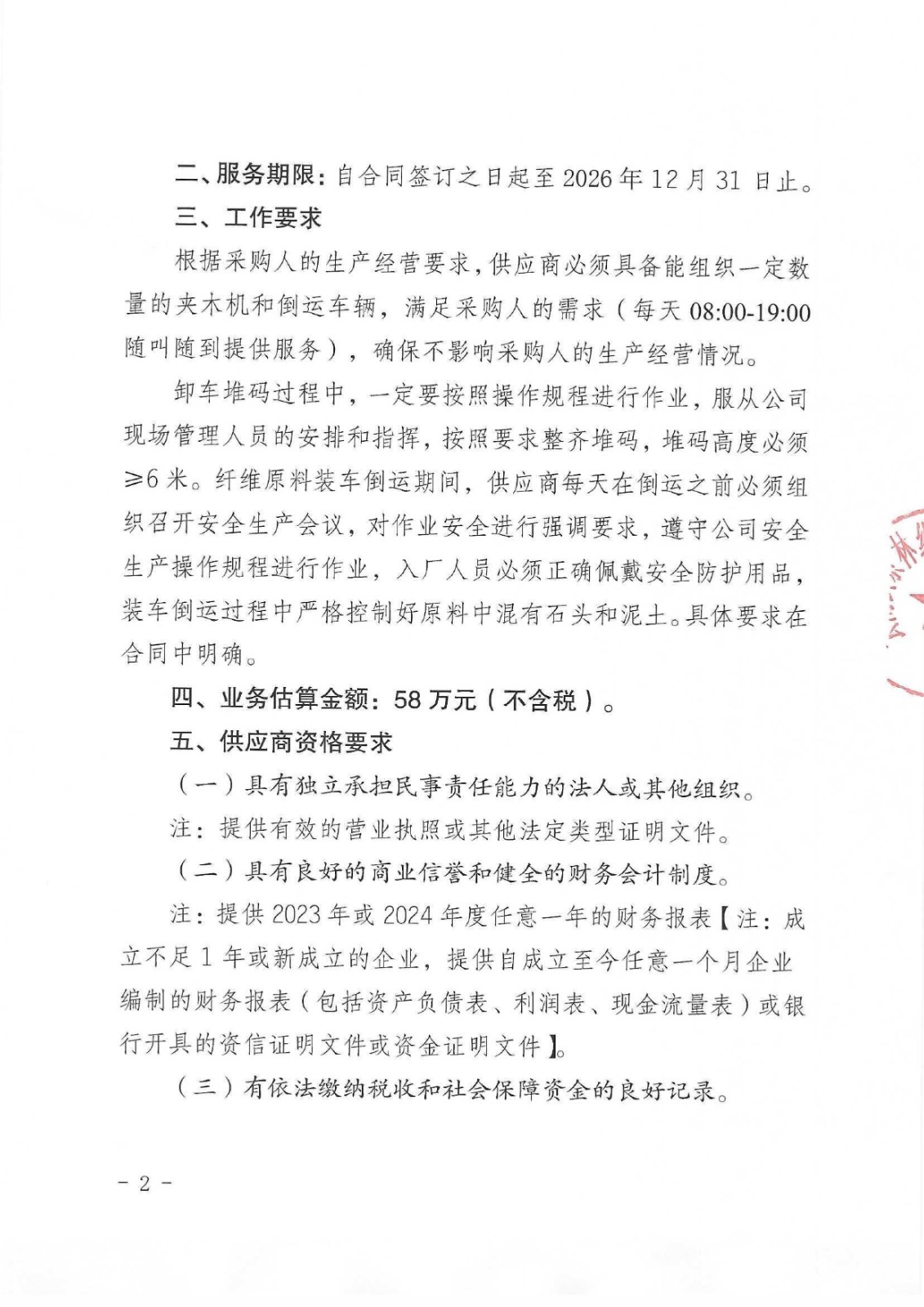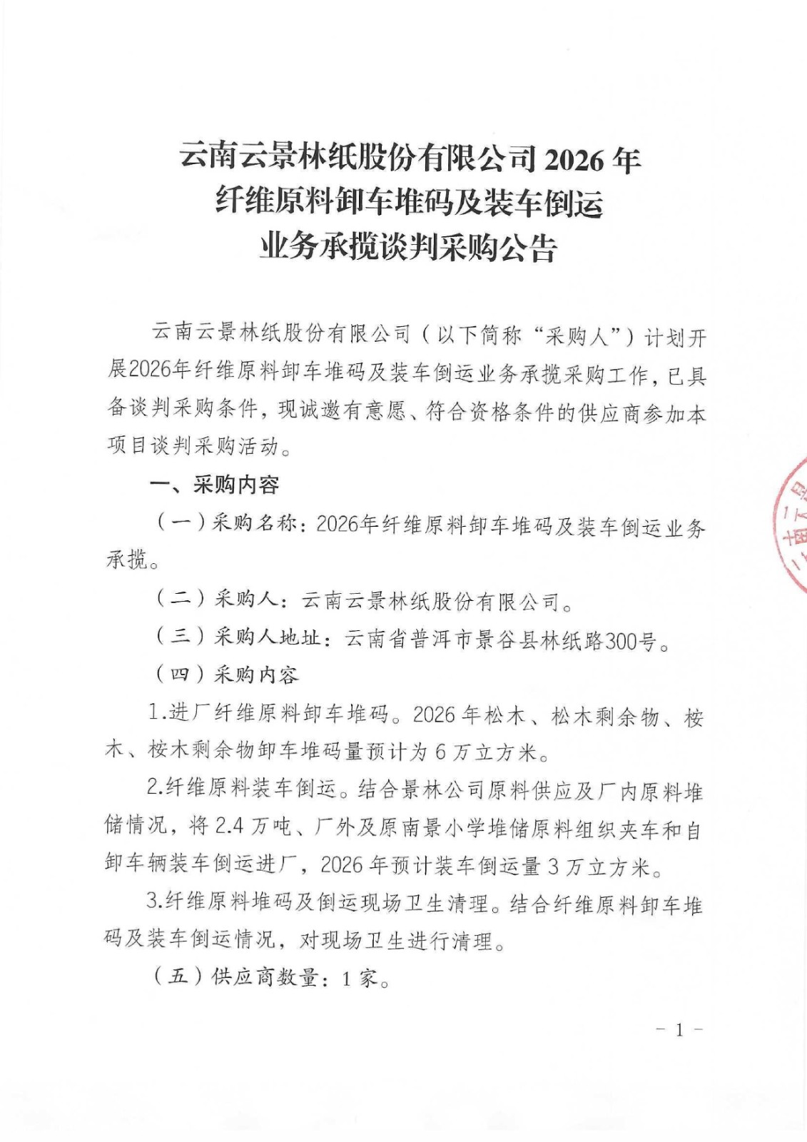 云南云景林紙股份有限公司2026年纖維原料卸車堆碼及裝車倒運業(yè)務承攬談判采購公告