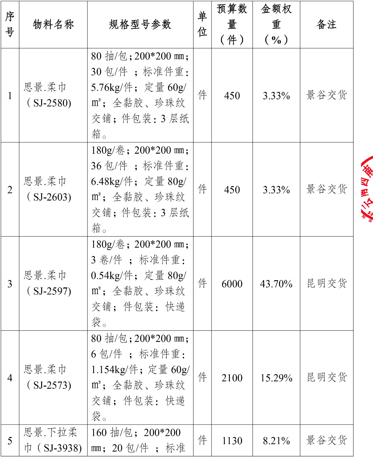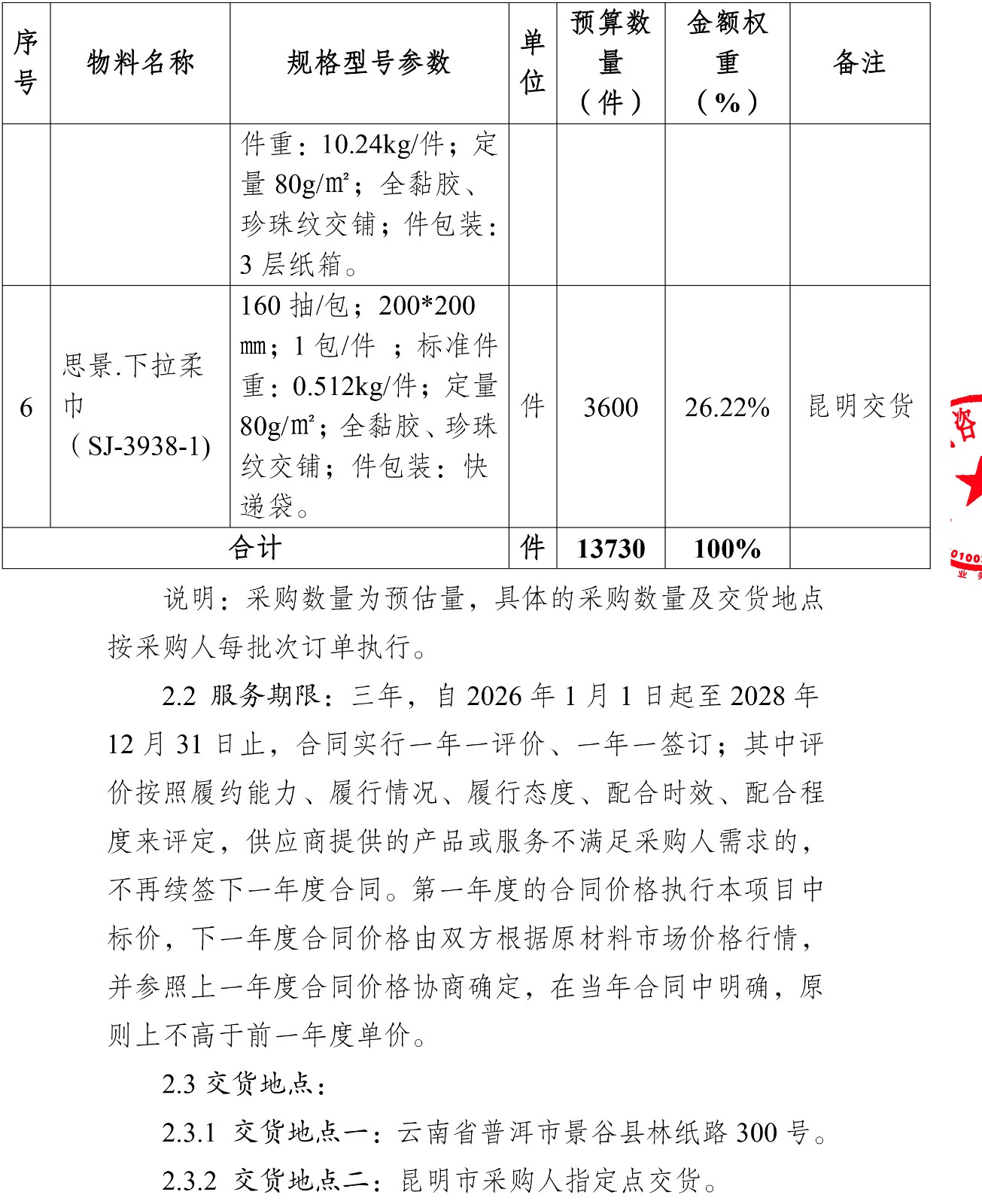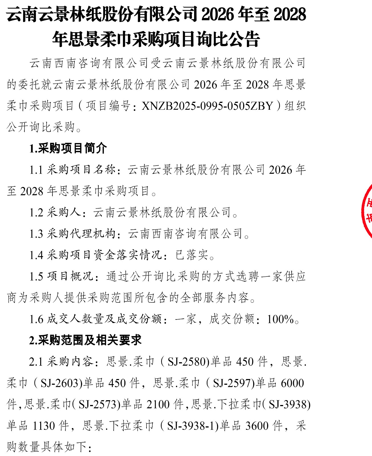 云南云景林紙股份有限公司2026年至2028年思景柔巾采購項目詢比公告