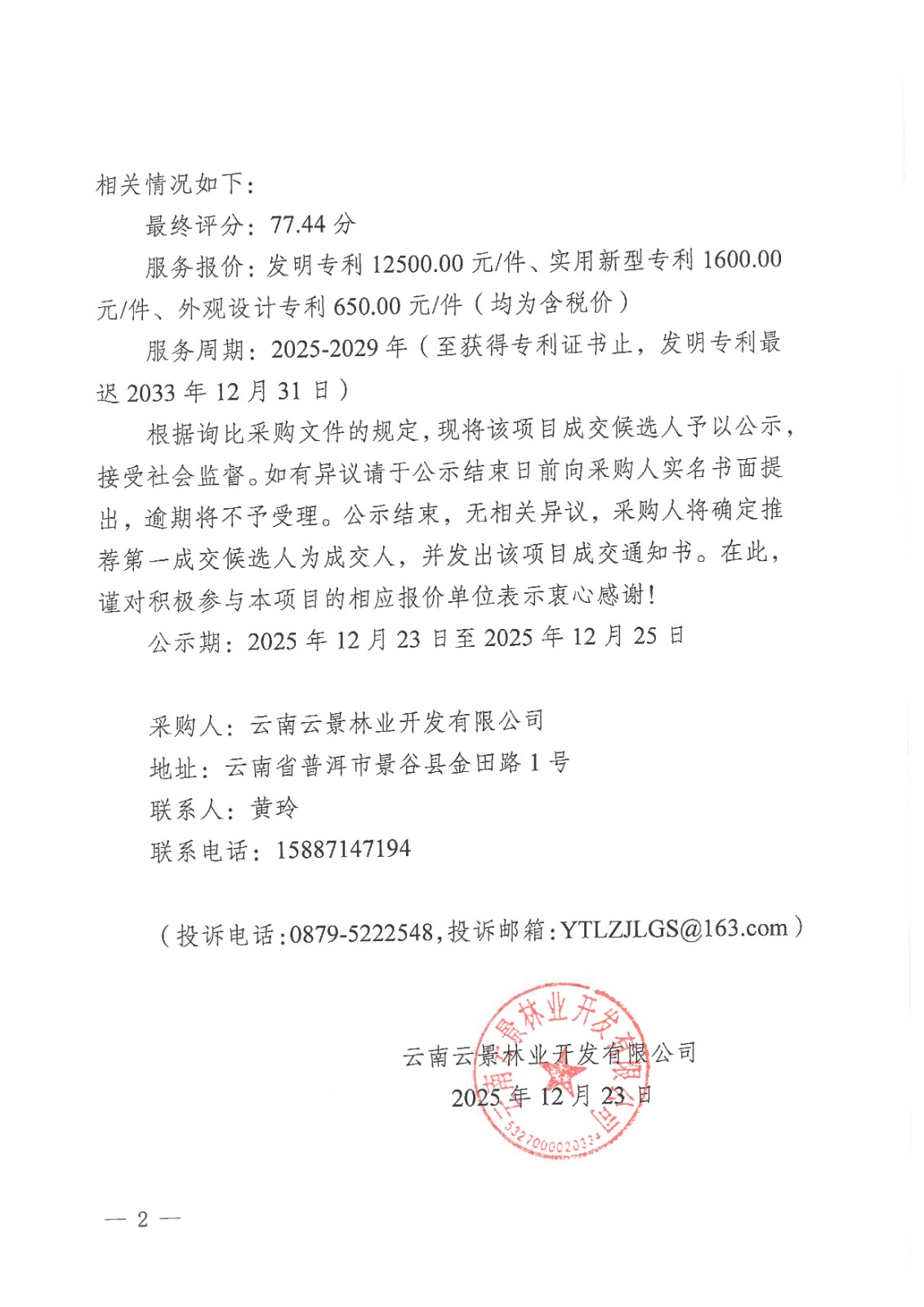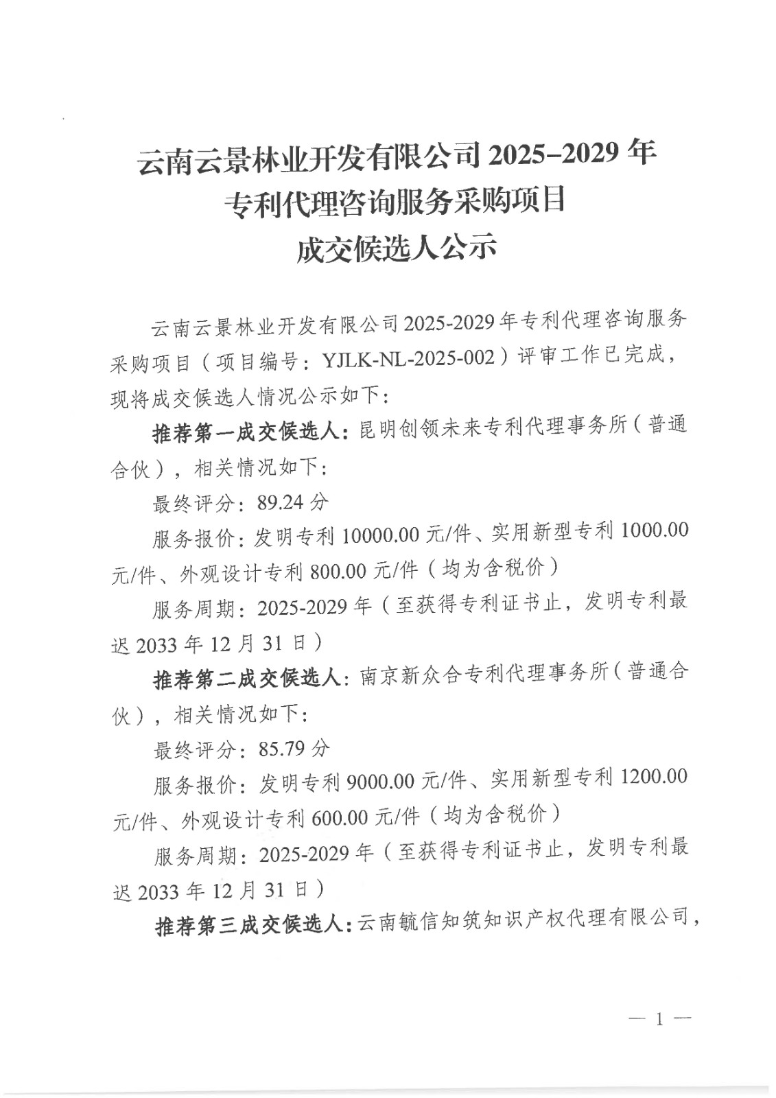 云南云景林業(yè)開發(fā)有限公司2025-2029年專利代理咨詢服務采購項目成交候選人公示