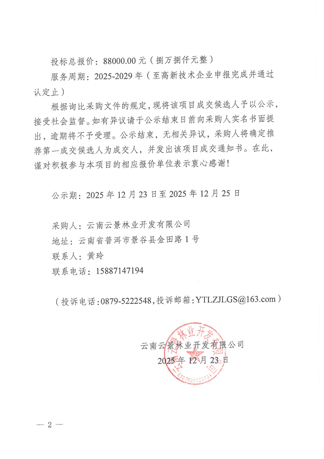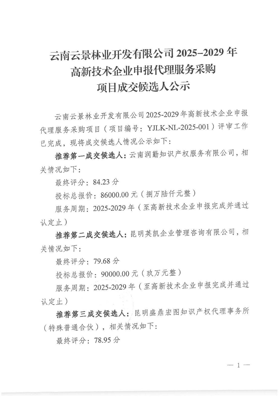 云南云景林業(yè)開發(fā)有限公司2025-2029年高新技術(shù)企業(yè)申報(bào)代理服務(wù)采購(gòu)項(xiàng)目成交候選人公示