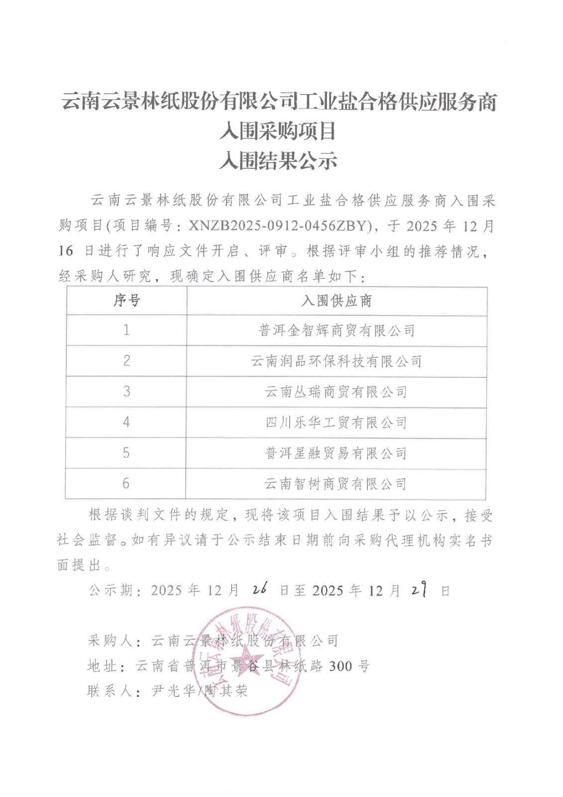云南云景林紙股份有限公司工業(yè)鹽合格供應(yīng)服務(wù)商入圍采購項(xiàng)目入圍結(jié)果公示
