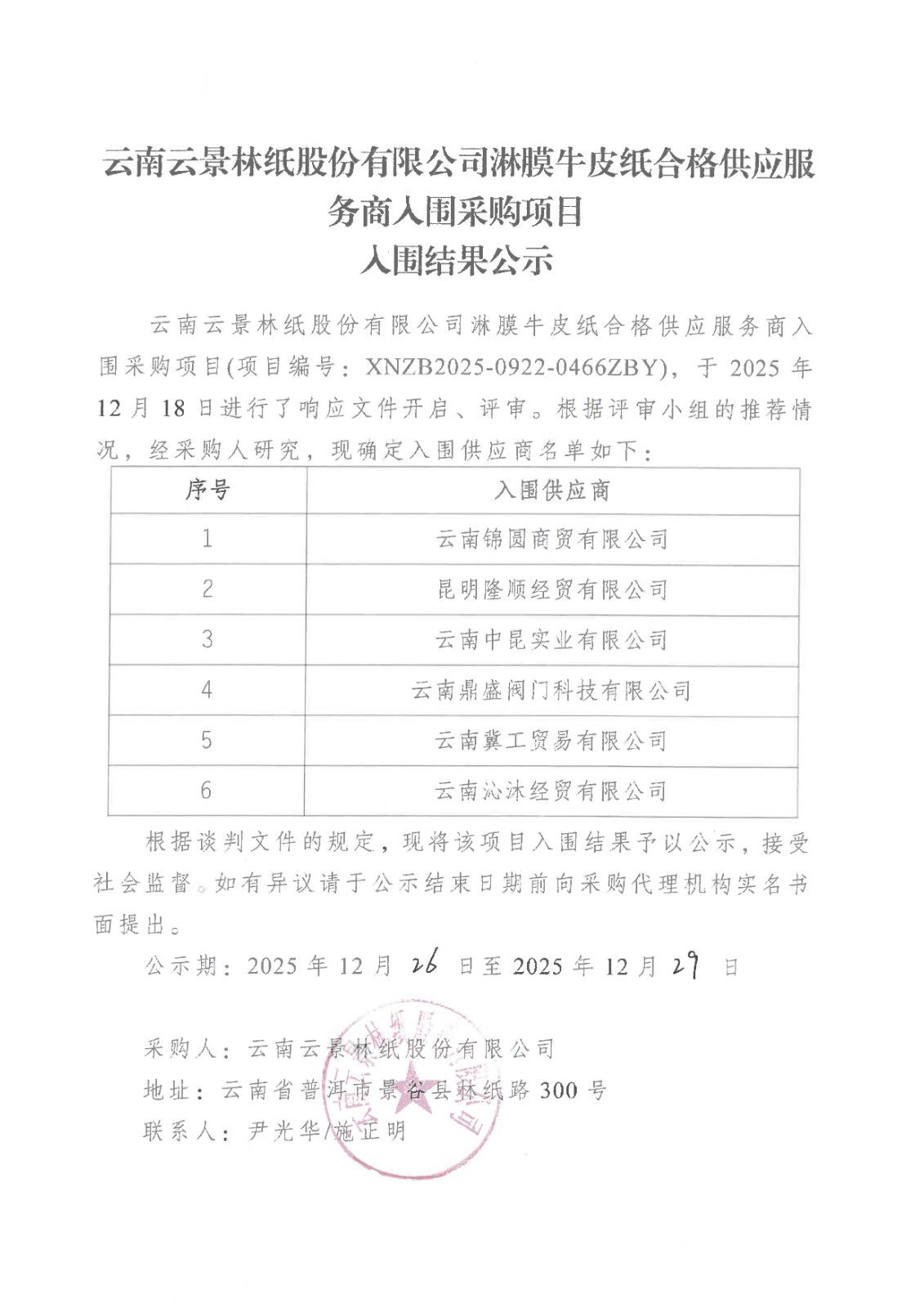云南云景林紙股份有限公司淋膜牛皮紙合格供應(yīng)服務(wù)商入圍采購(gòu)項(xiàng)目入圍結(jié)果公示