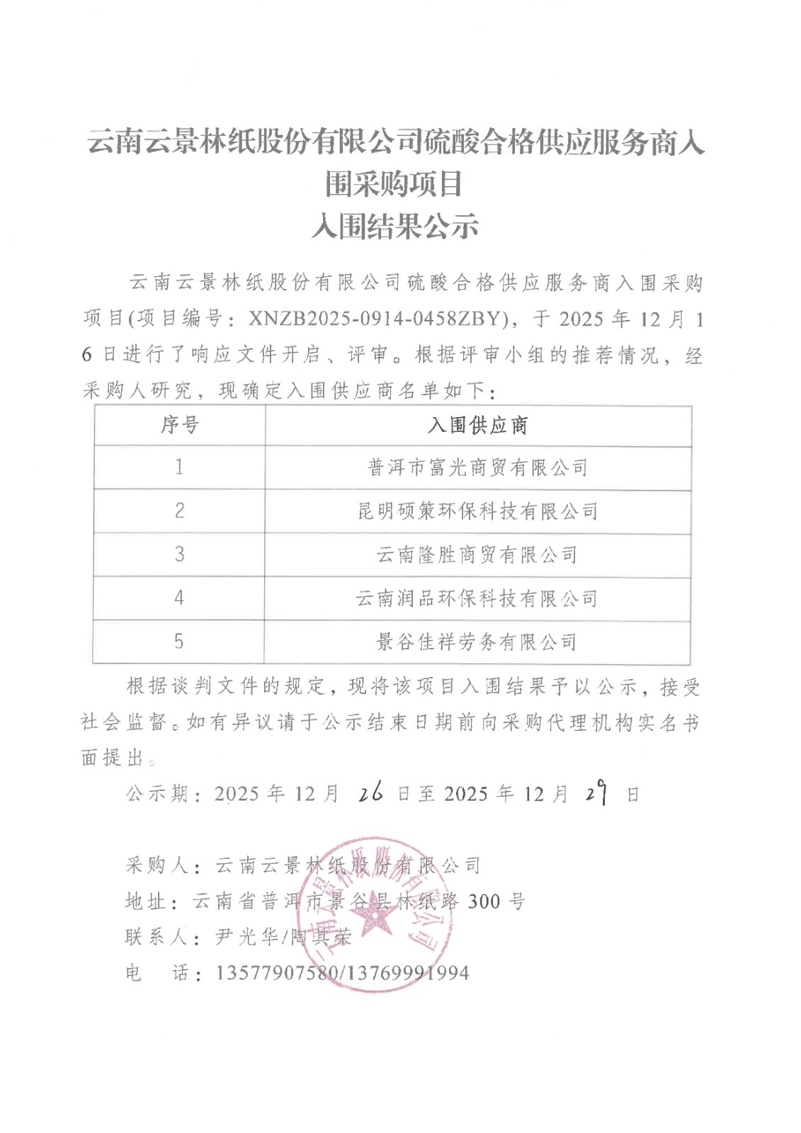 云南云景林紙股份有限公司硫酸合格供應(yīng)服務(wù)商入圍采購項目入圍結(jié)果公示