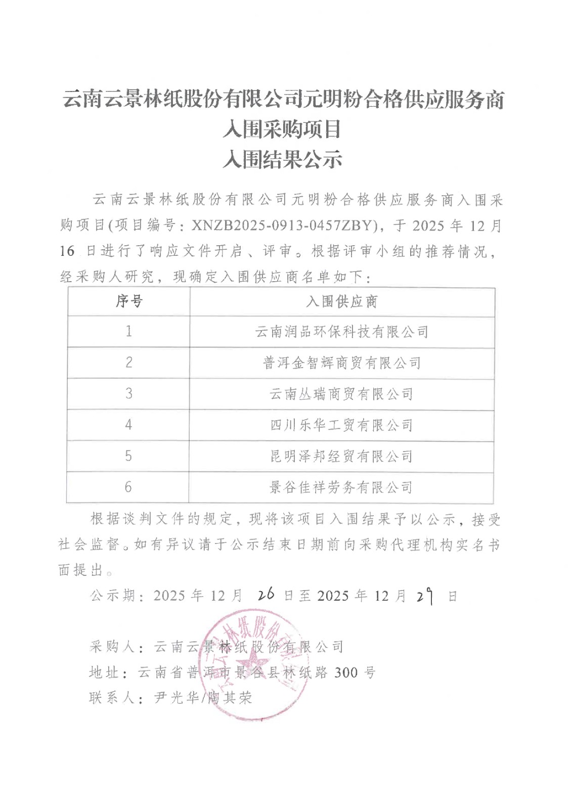 云南云景林紙股份有限公司元明粉合格供應(yīng)服務(wù)商入圍采購項(xiàng)目入圍結(jié)果公示