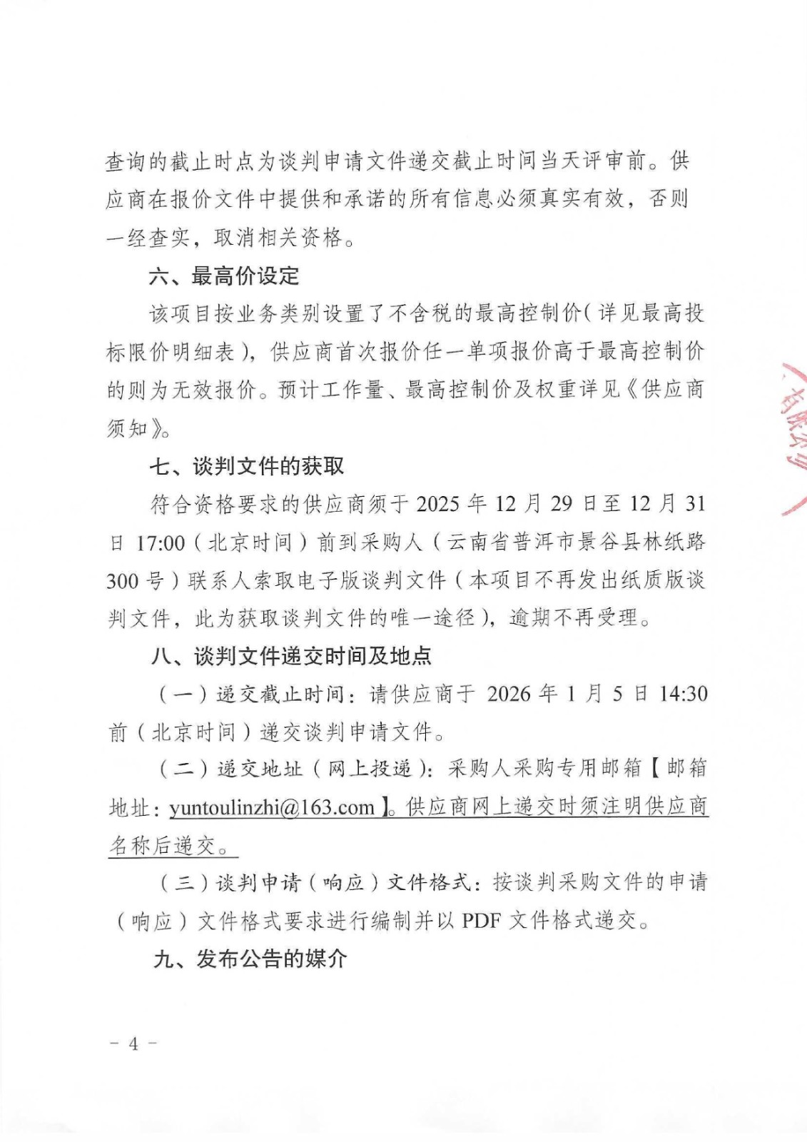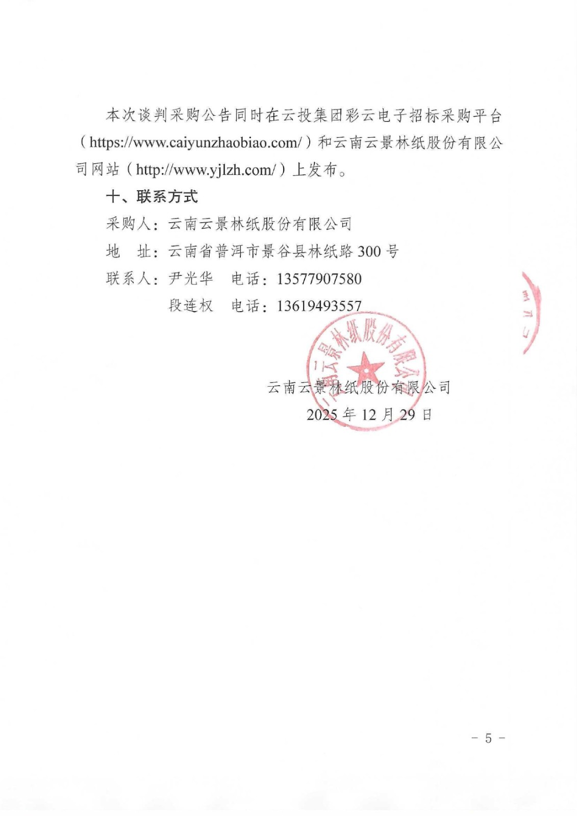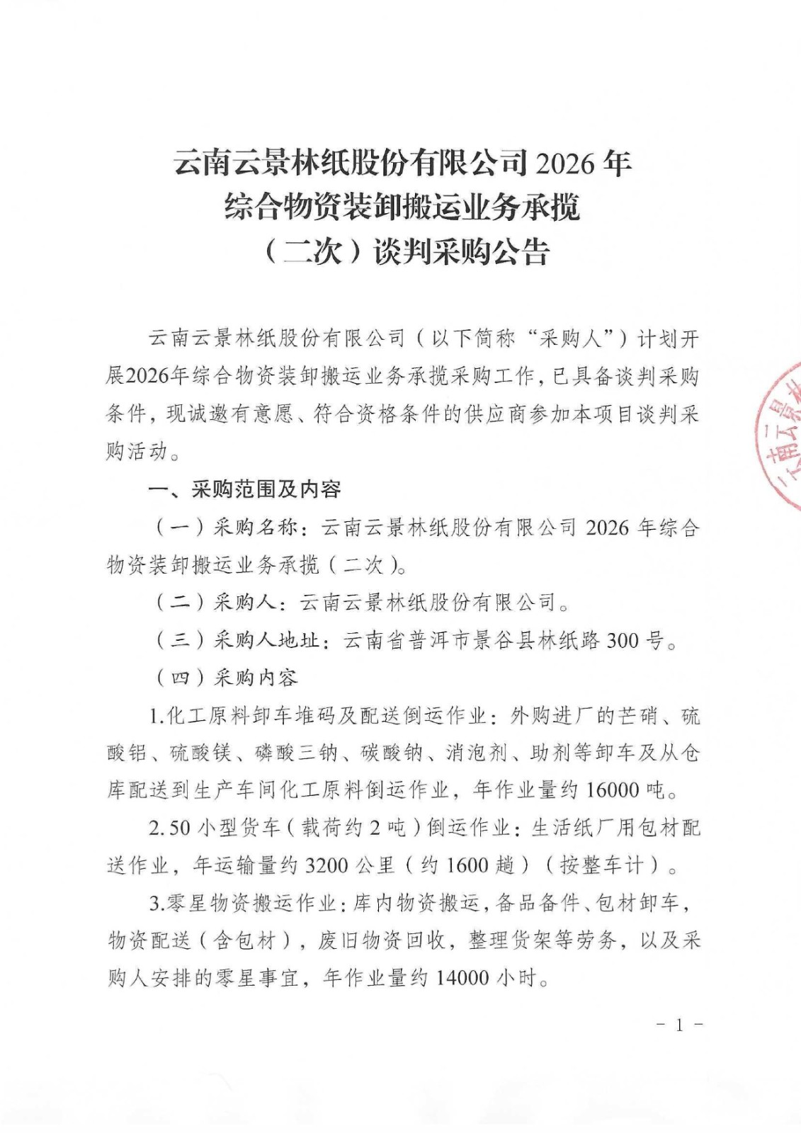 云南云景林紙股份有限公司2026年綜合物資裝卸搬運業(yè)務(wù)承攬(二次)談判采購公告