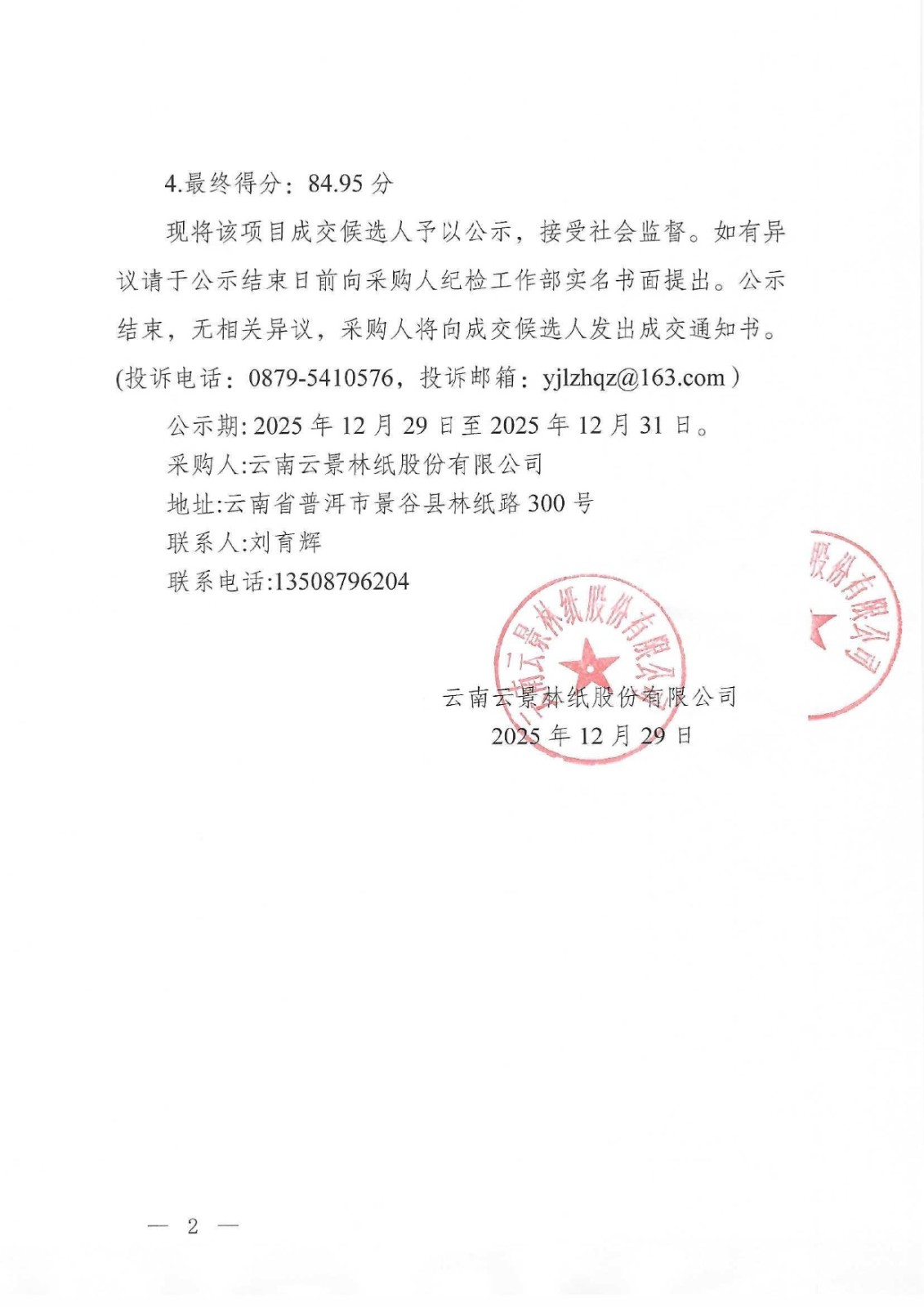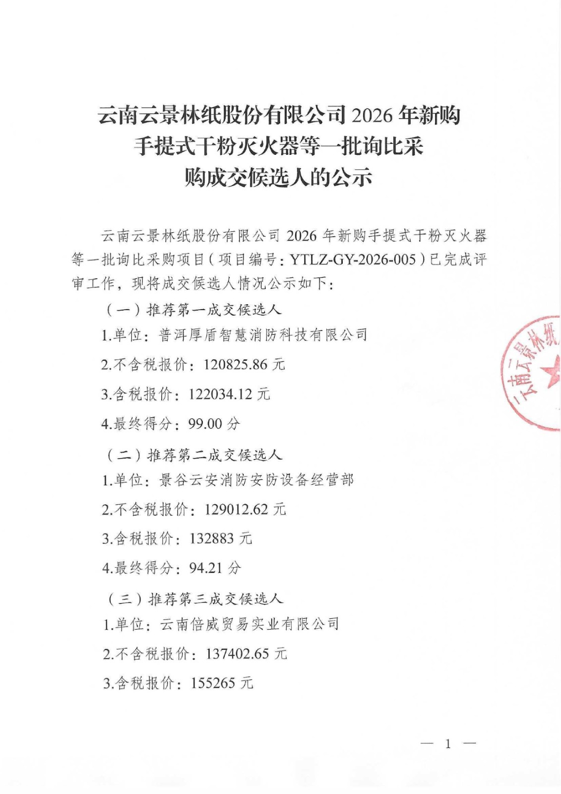 云南云景林紙股份有限公司2026年新購手提式干粉滅火器等一批詢比采購成交候選人的公示