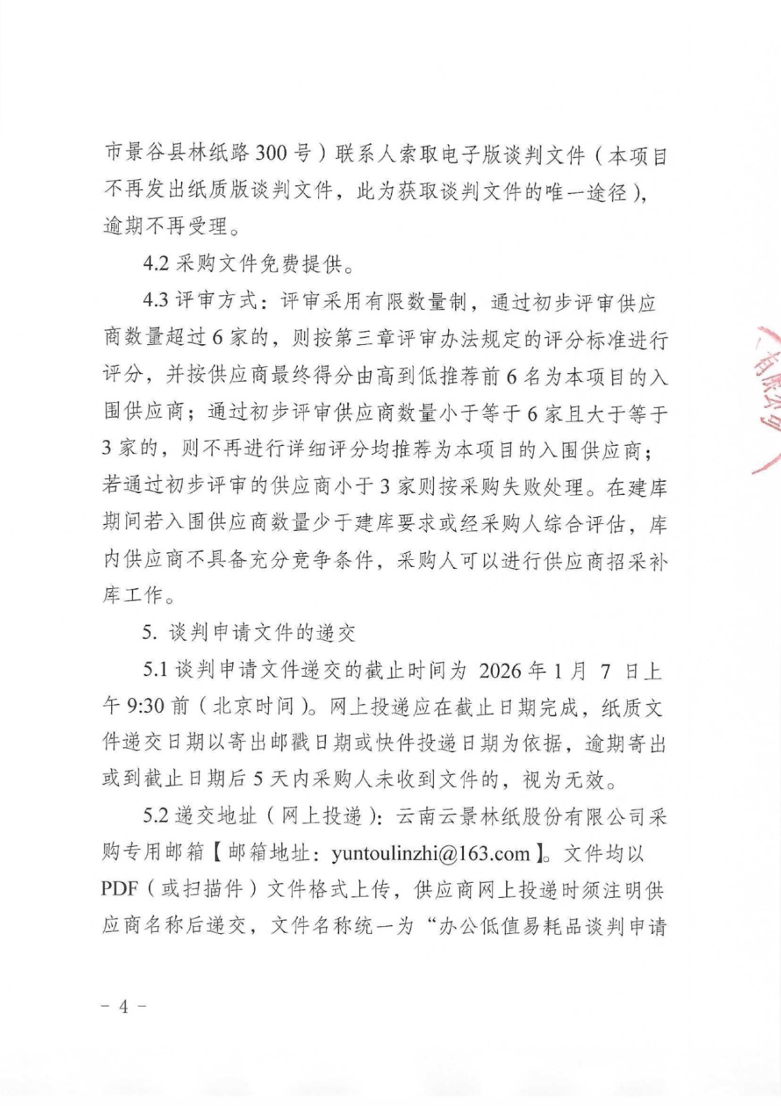 云南云景林紙股份有限公司2026年辦公低值易耗品合格供應(yīng)服務(wù)商人圍二次談判采購(gòu)公告