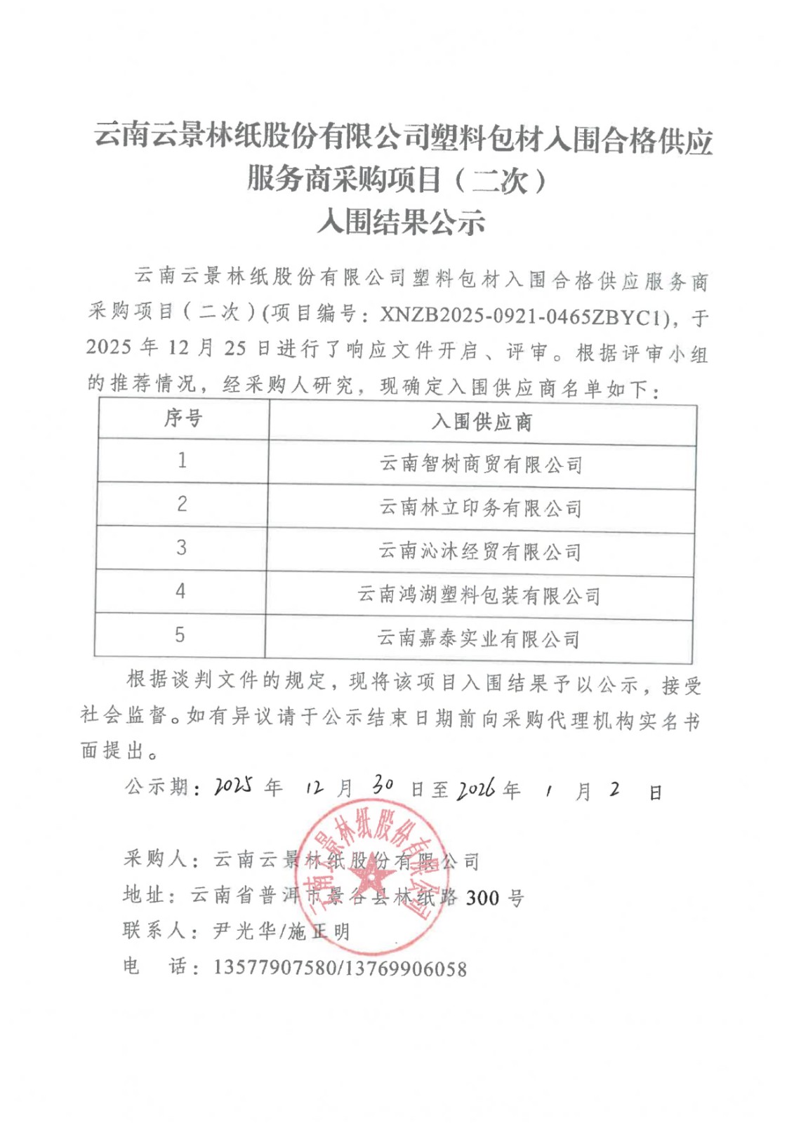 云南云景林紙股份有限公司塑料包材人圍合格供應(yīng)服務(wù)商采購(gòu)項(xiàng)目(二次)人圍結(jié)果公示