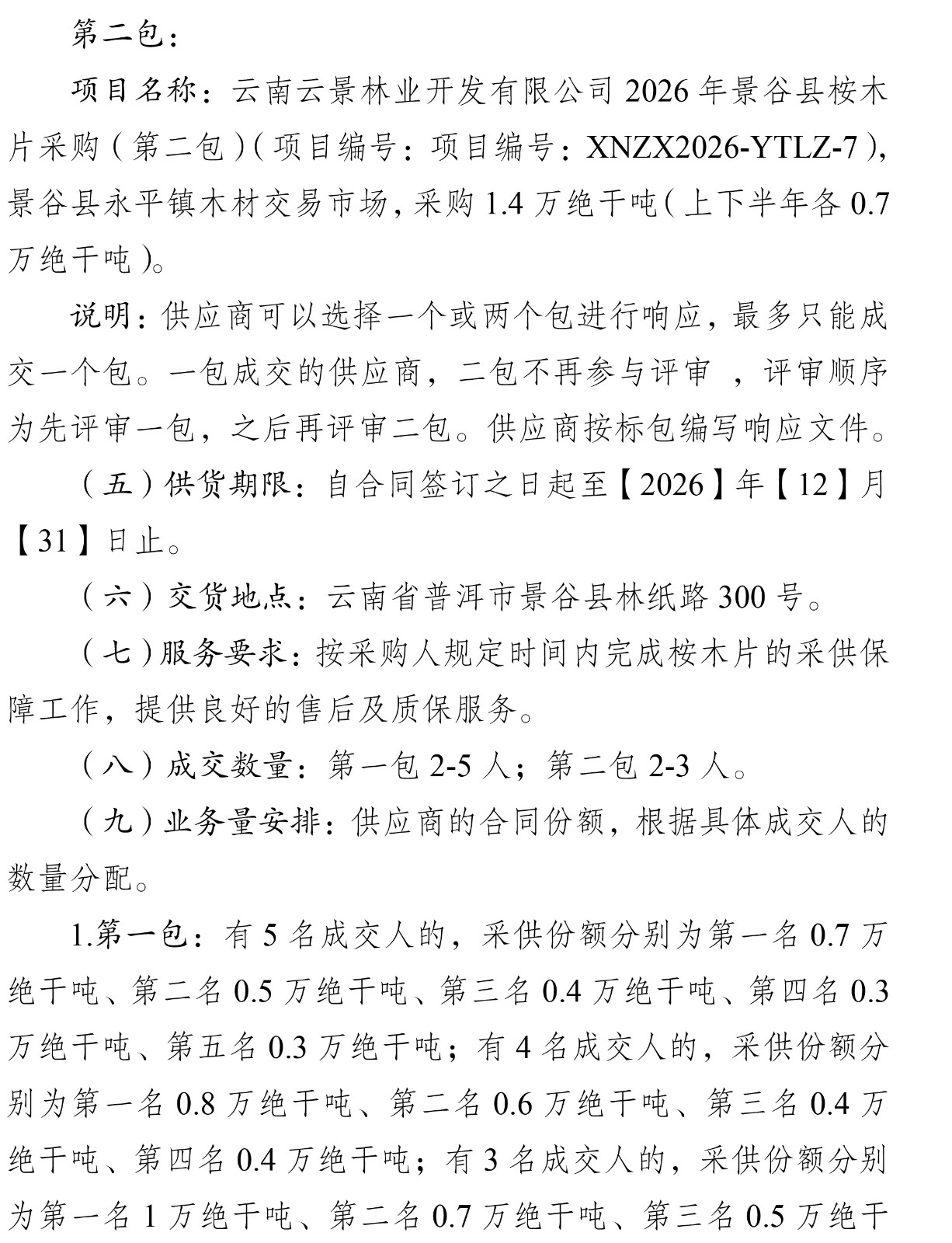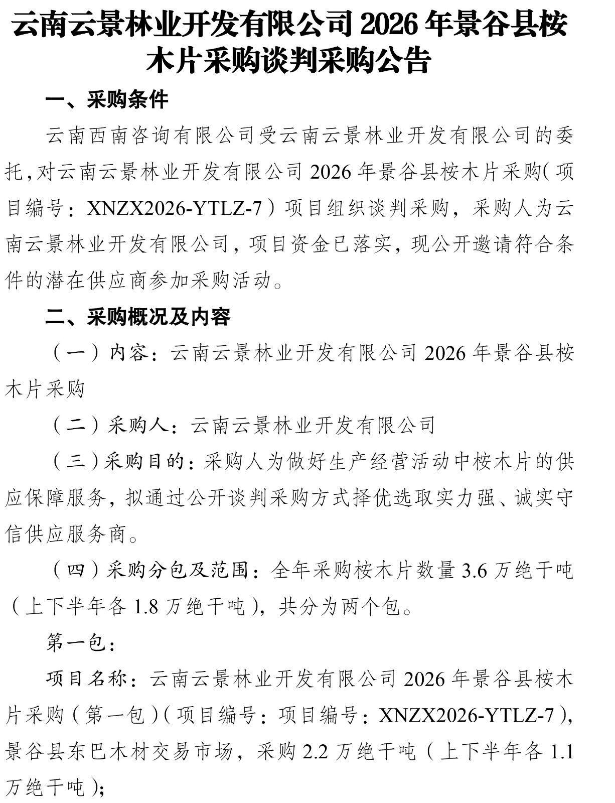 云南云景林業(yè)開發(fā)有限公司2026年景谷縣桉木片采購談判采購公告
